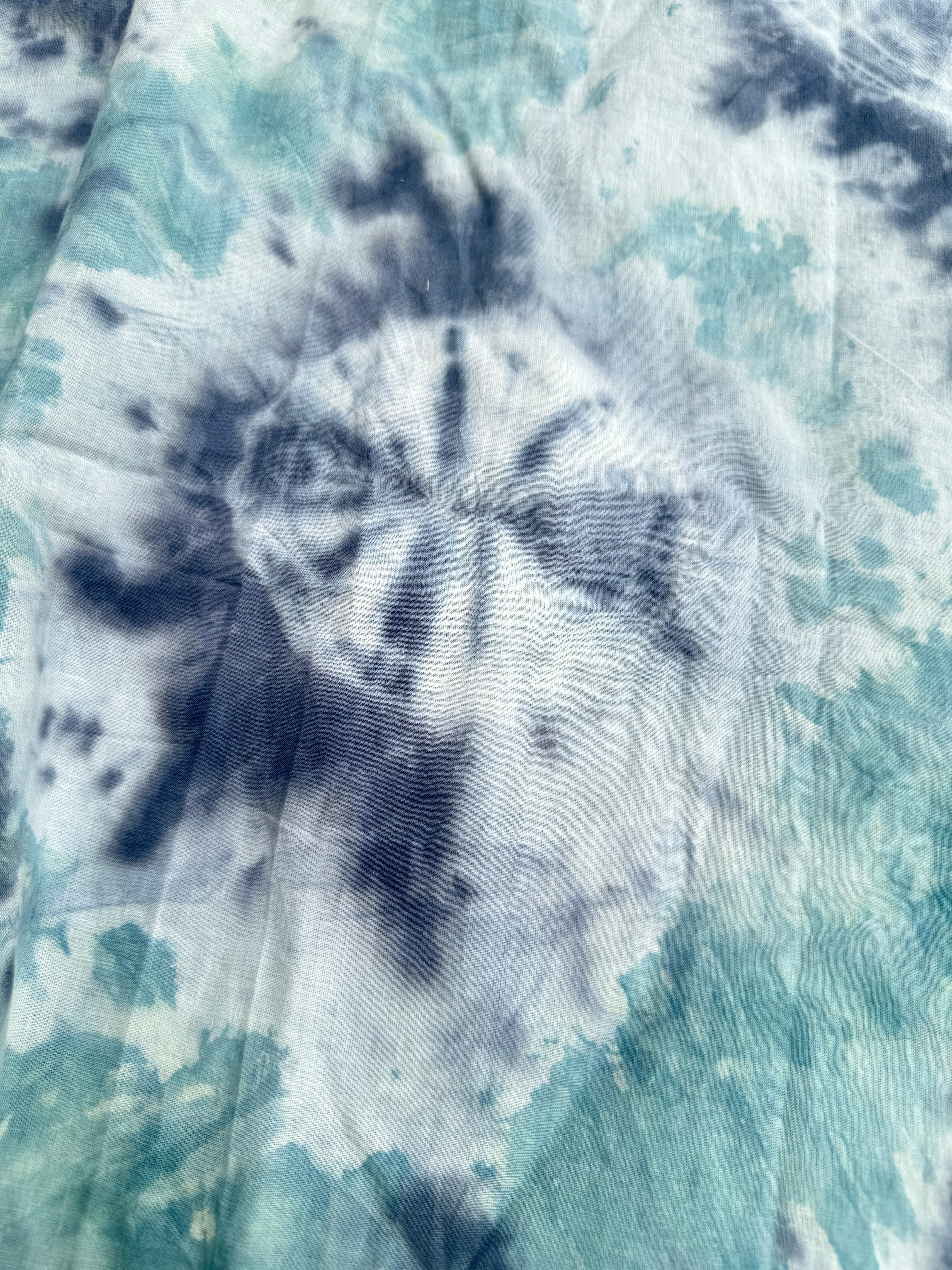 手作業で染め上げられた生地です。糸で縛り上げた生地を染料につけて模様付けされたものです。