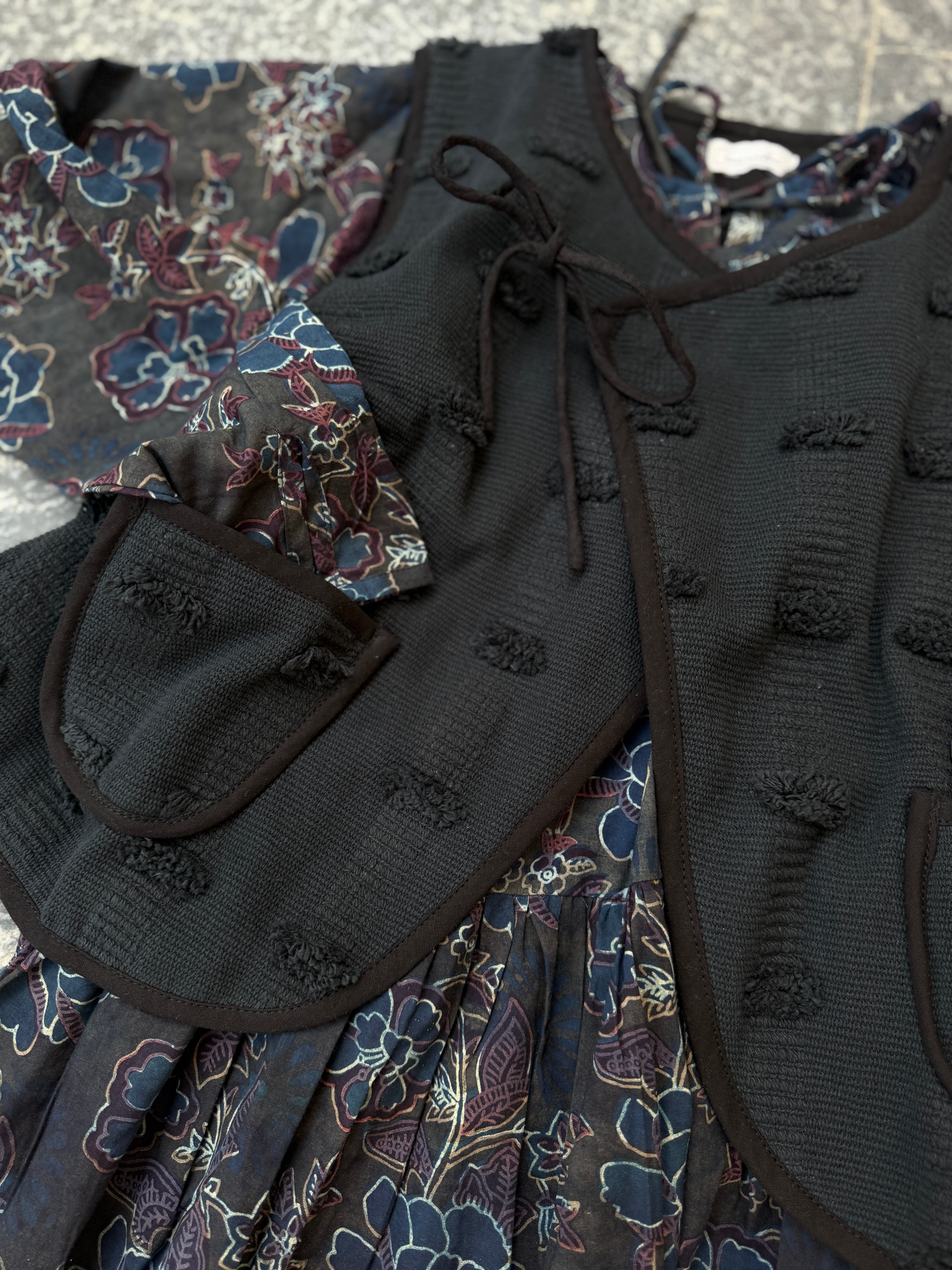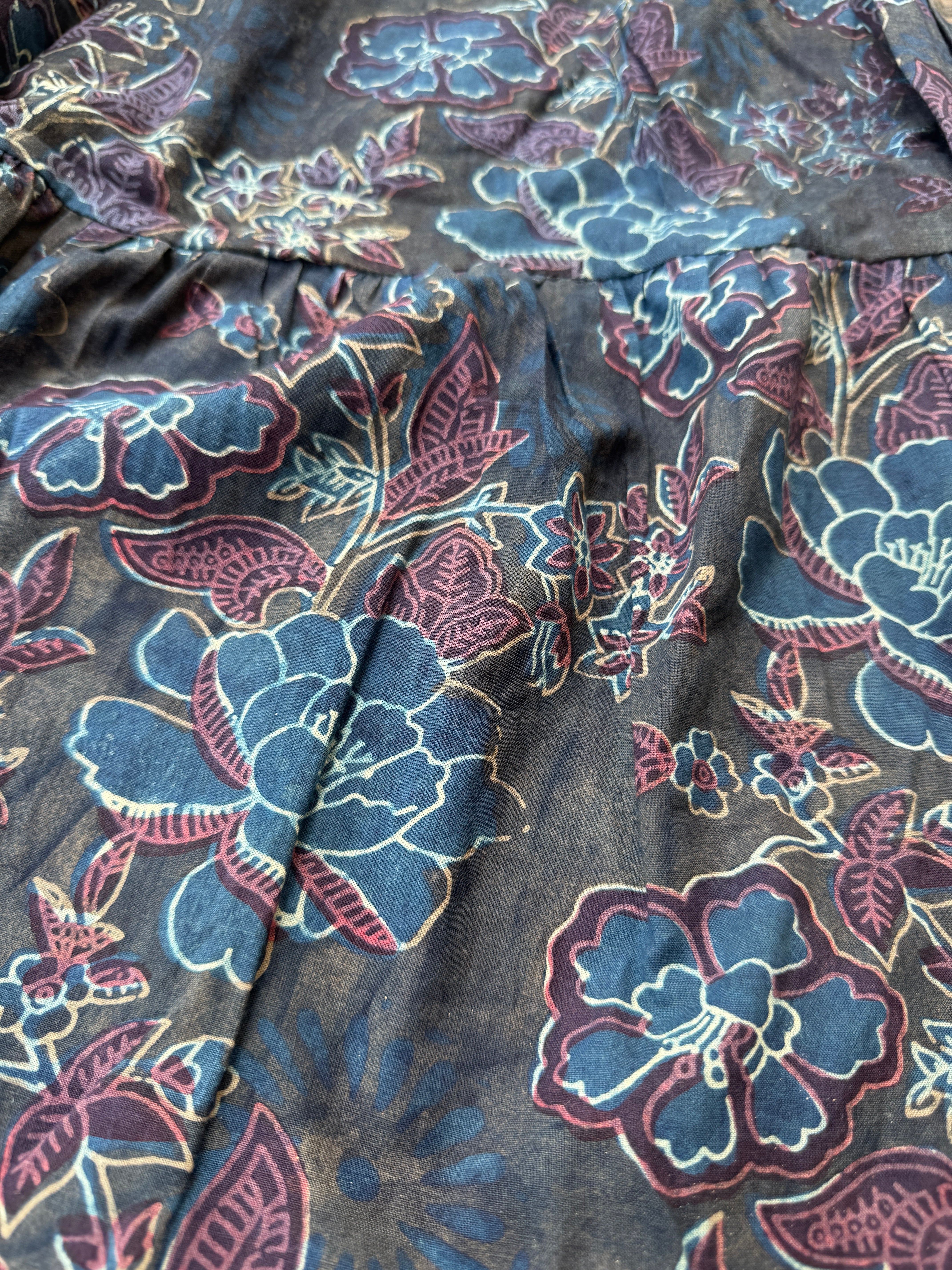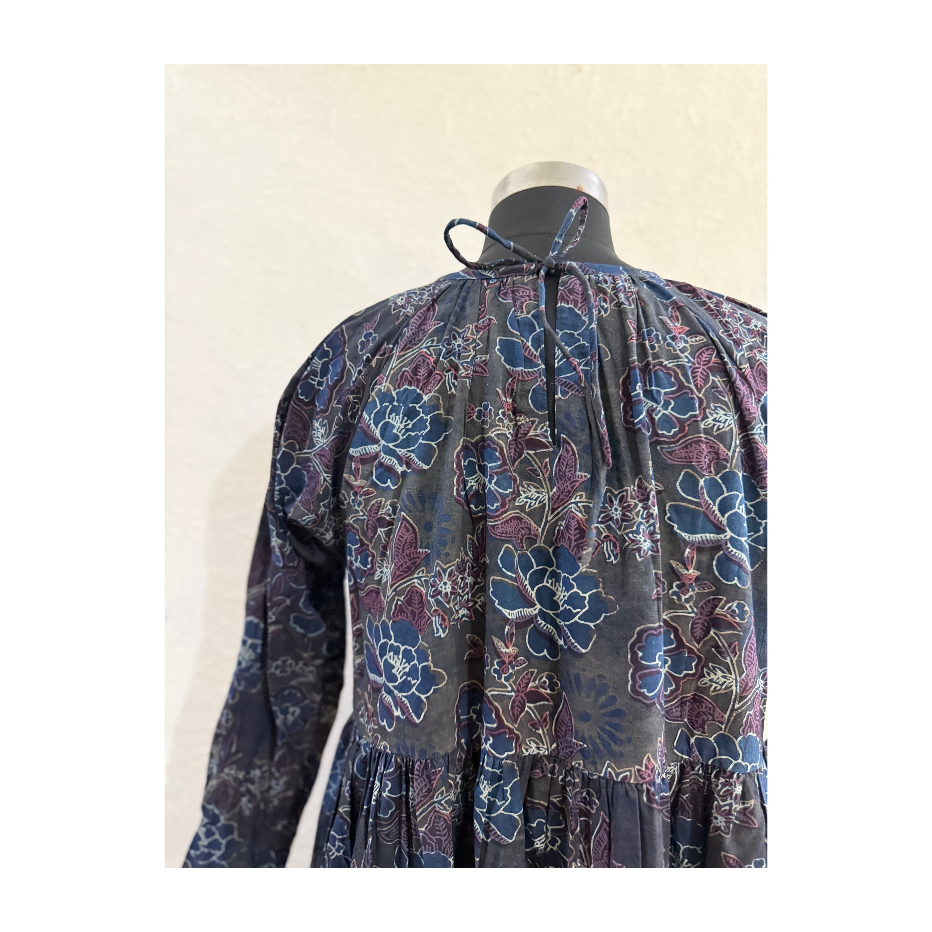 saruche ブロックプリント Raglan ギャザーワンピース Ajrakh Charcoal