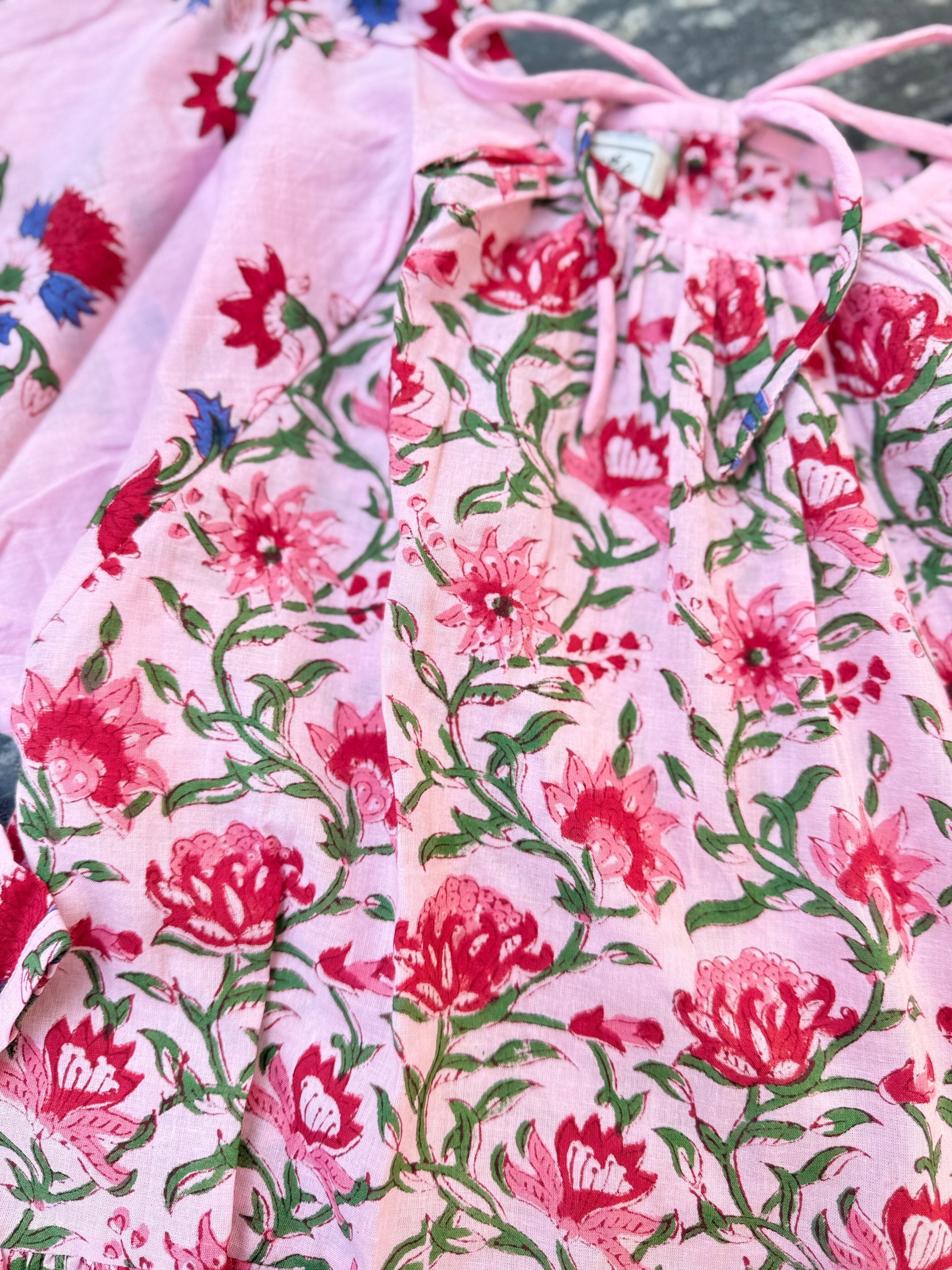 saruche ブロックプリント Raglan ギャザーワンピース Pink