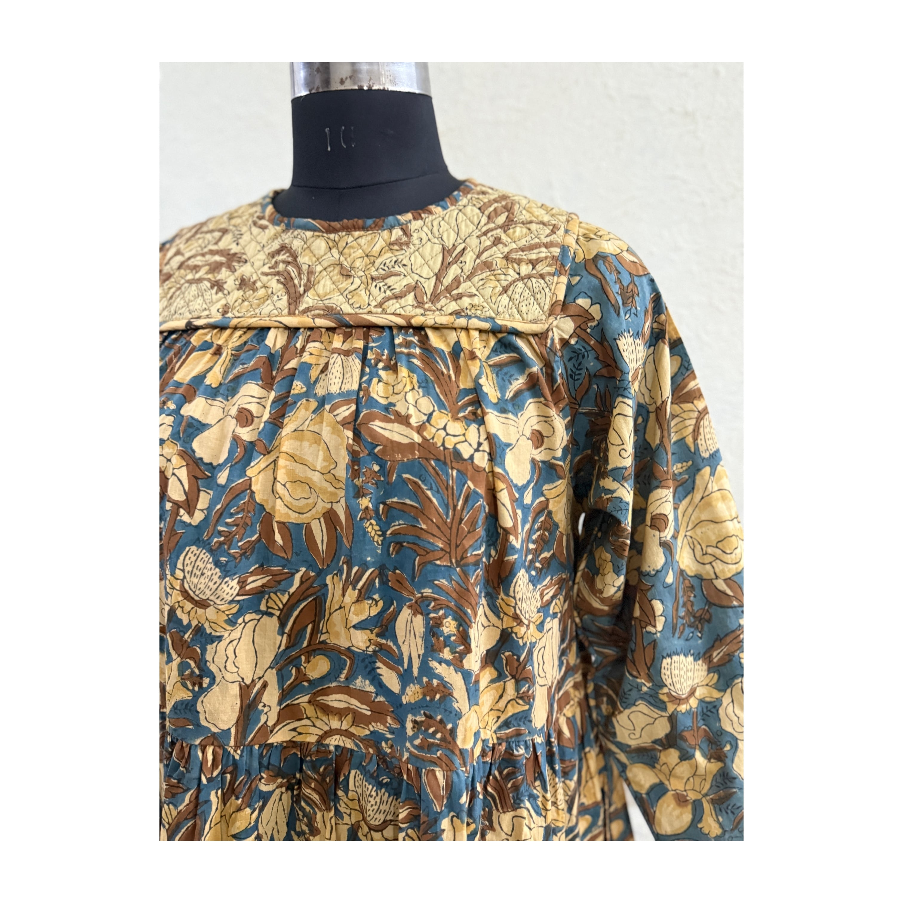 saruche ブロックプリント スクエアヨークキルティングワンピース Blue Green