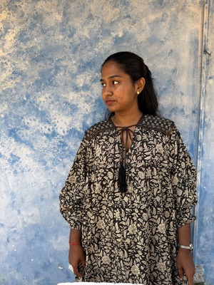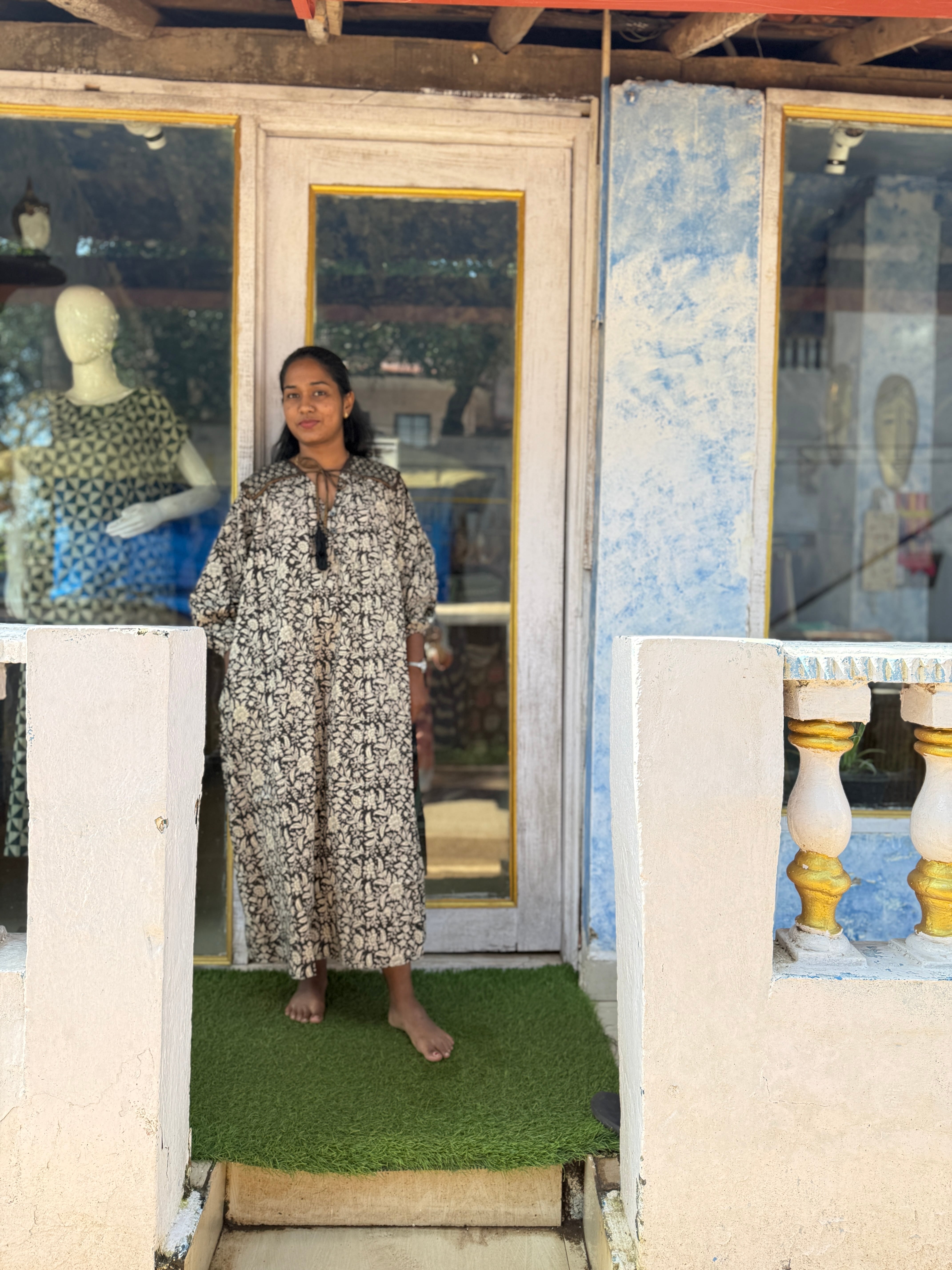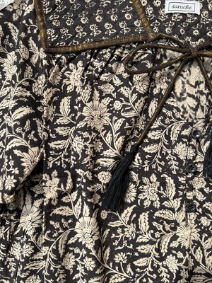 saruche ブロックプリント ショルダーキルトパッチ タッセルワンピース Black