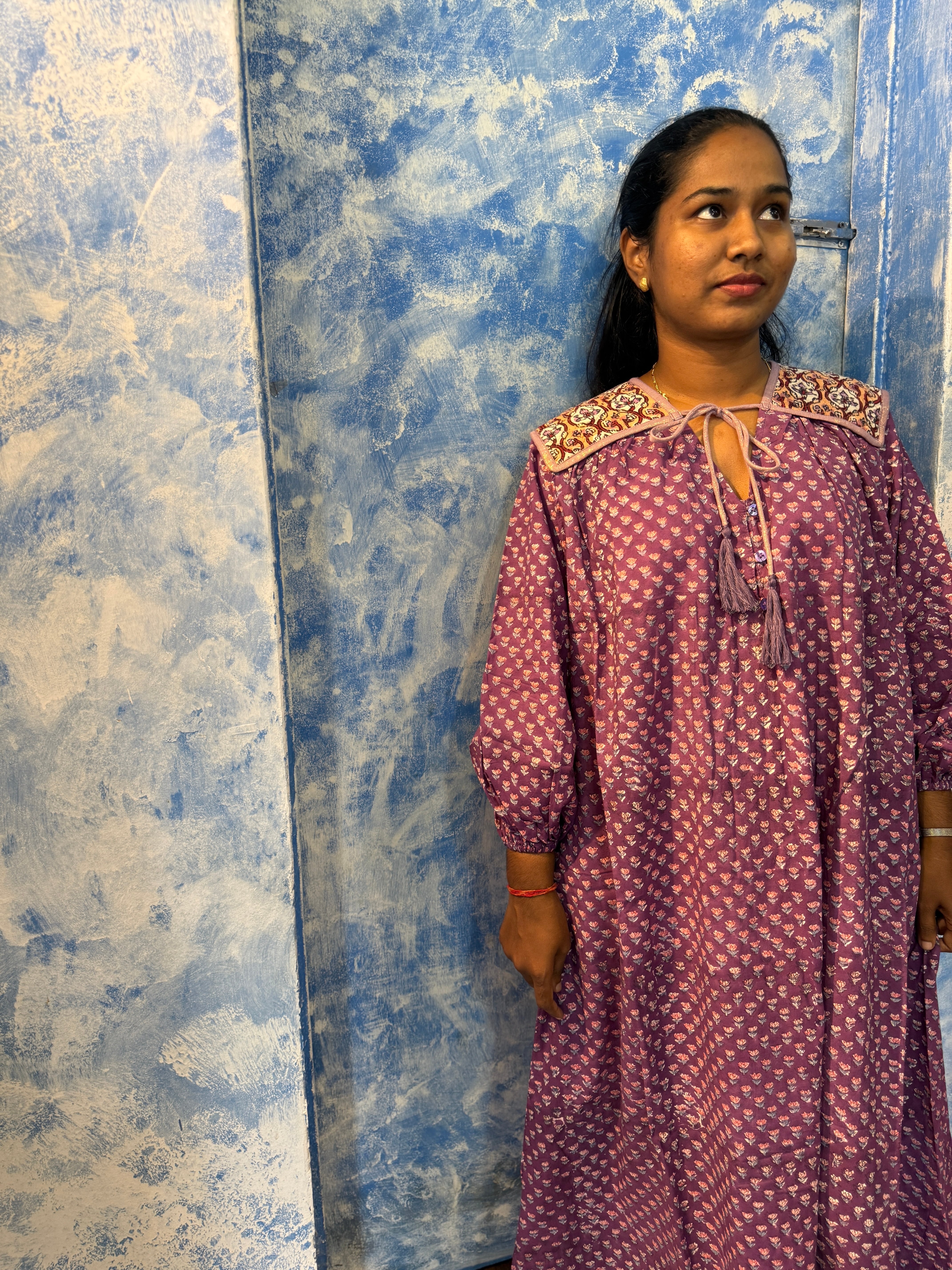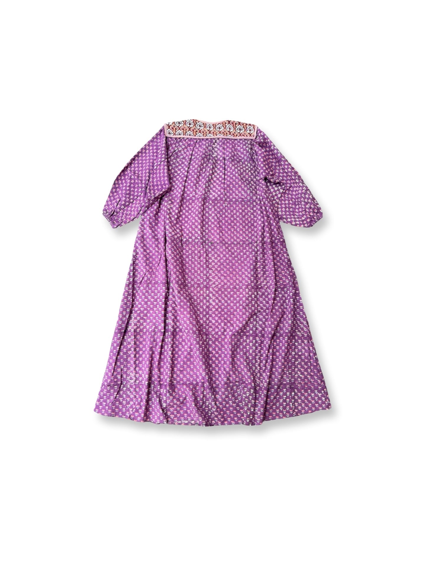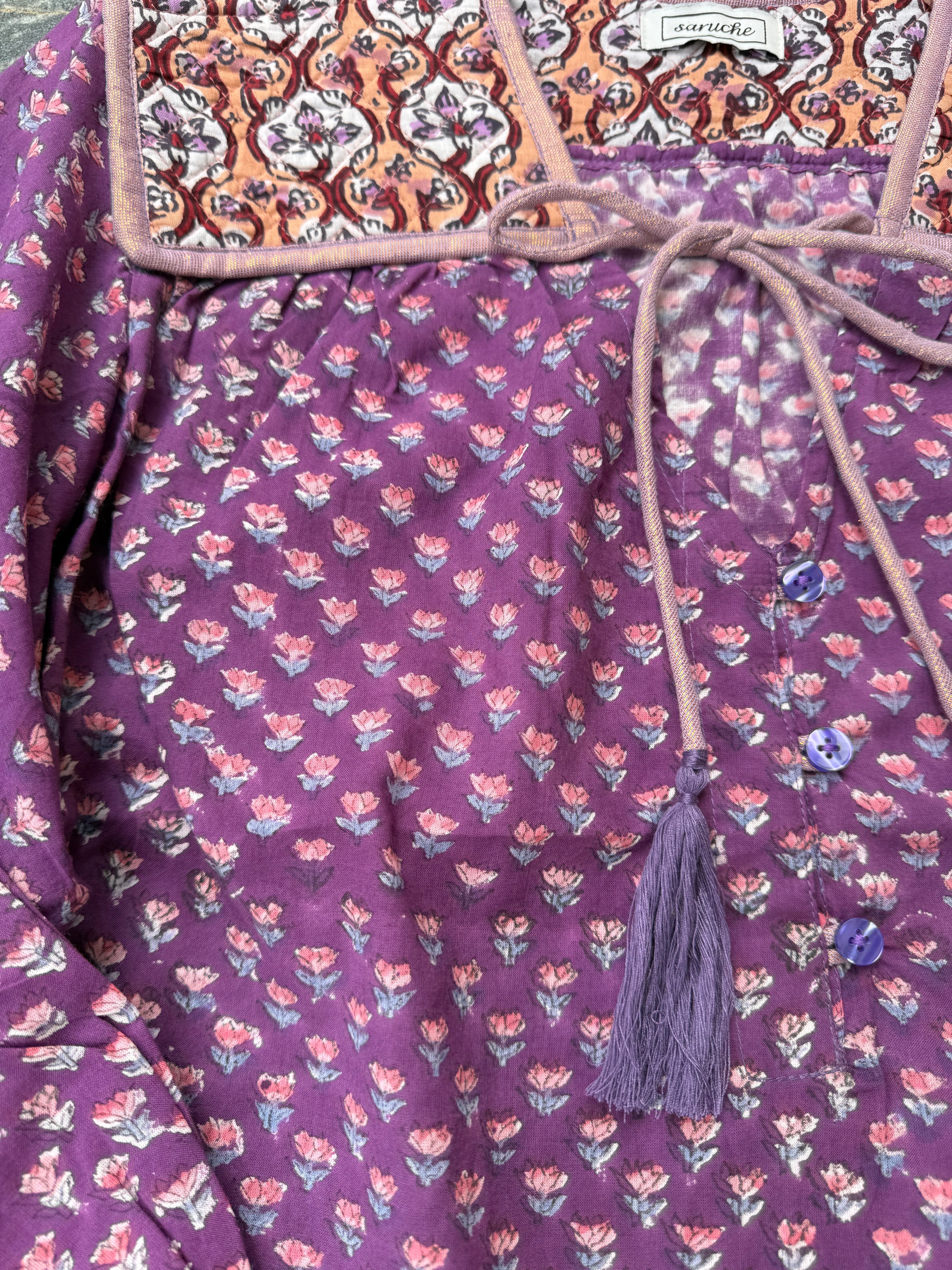 saruche ブロックプリント ショルダーキルトパッチ タッセルワンピース Purple