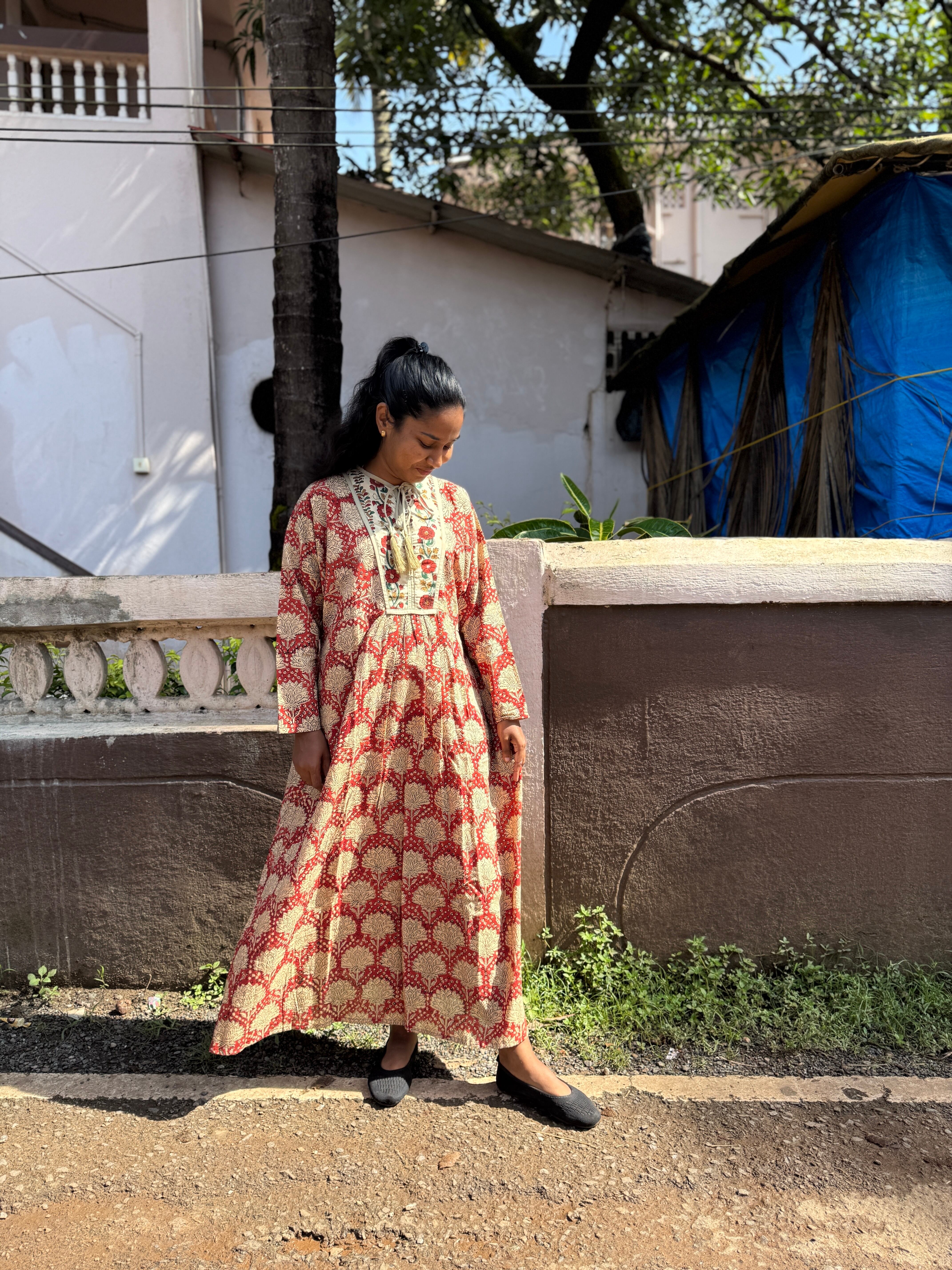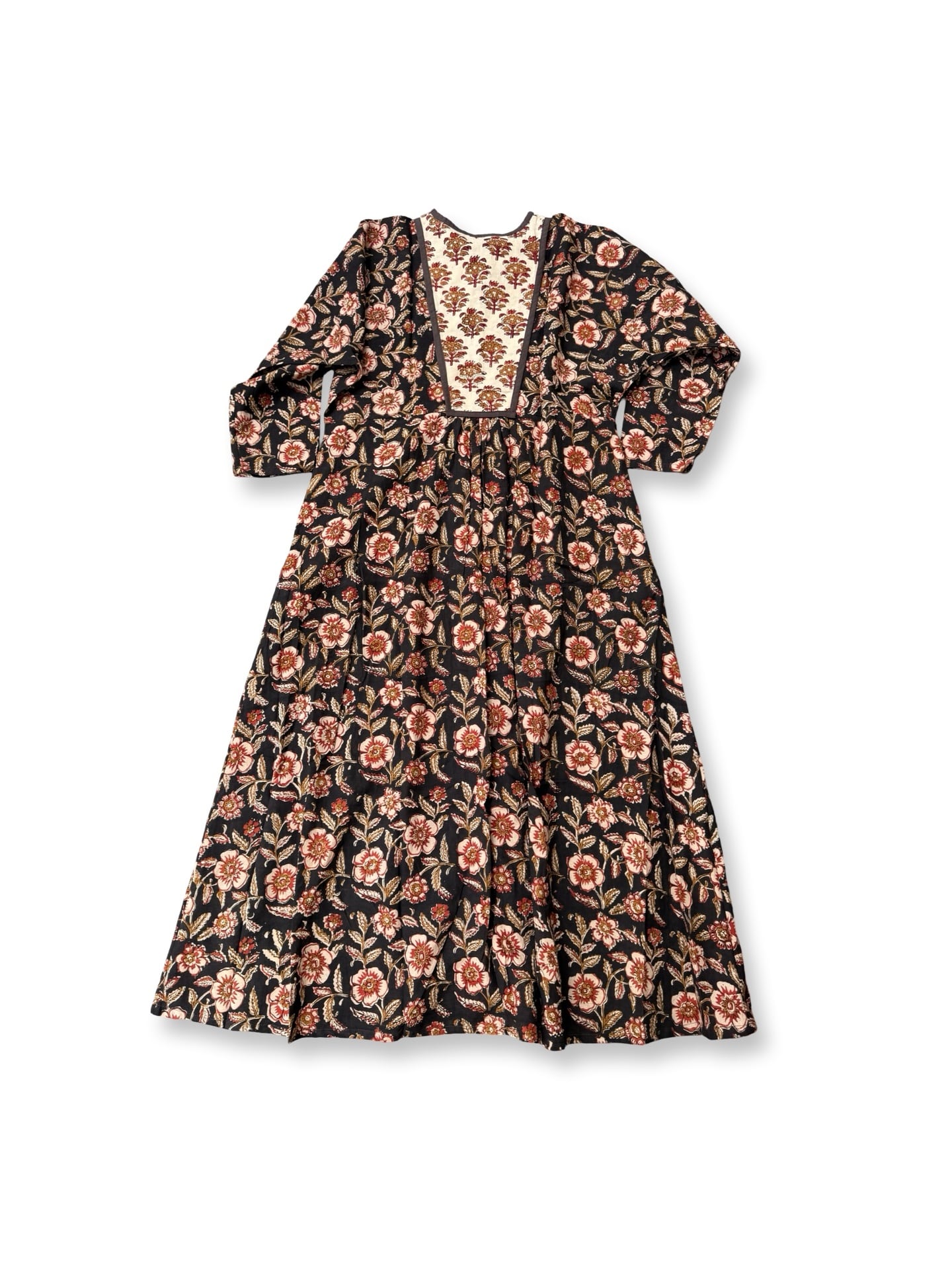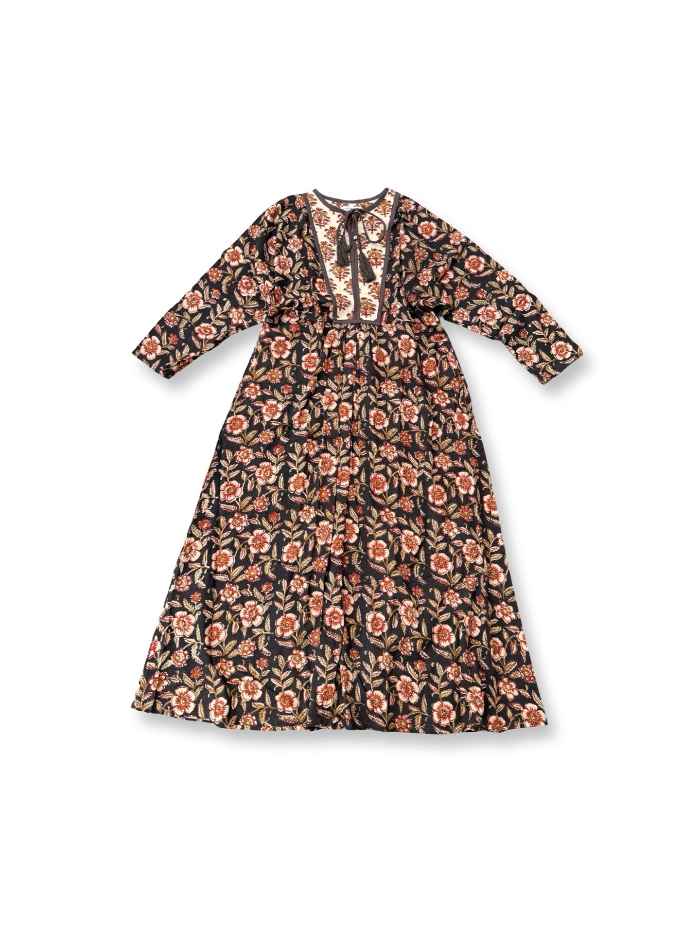 saruche ブロックプリント ナローヨークタッセルワンピース Ajrakh