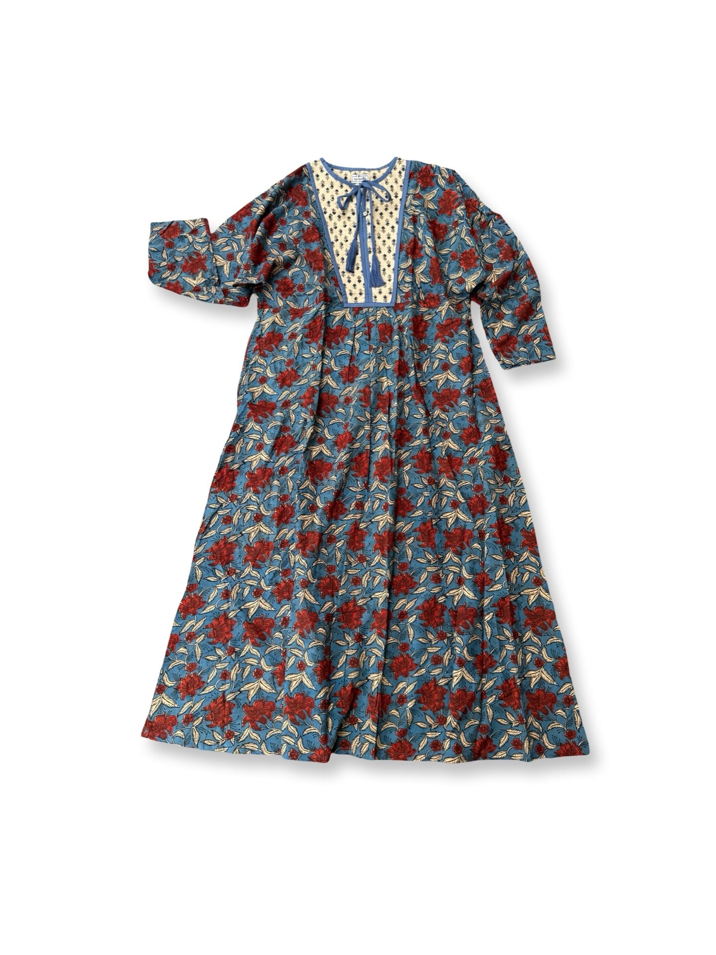 saruche ブロックプリント ナローヨークタッセルワンピース Indigo