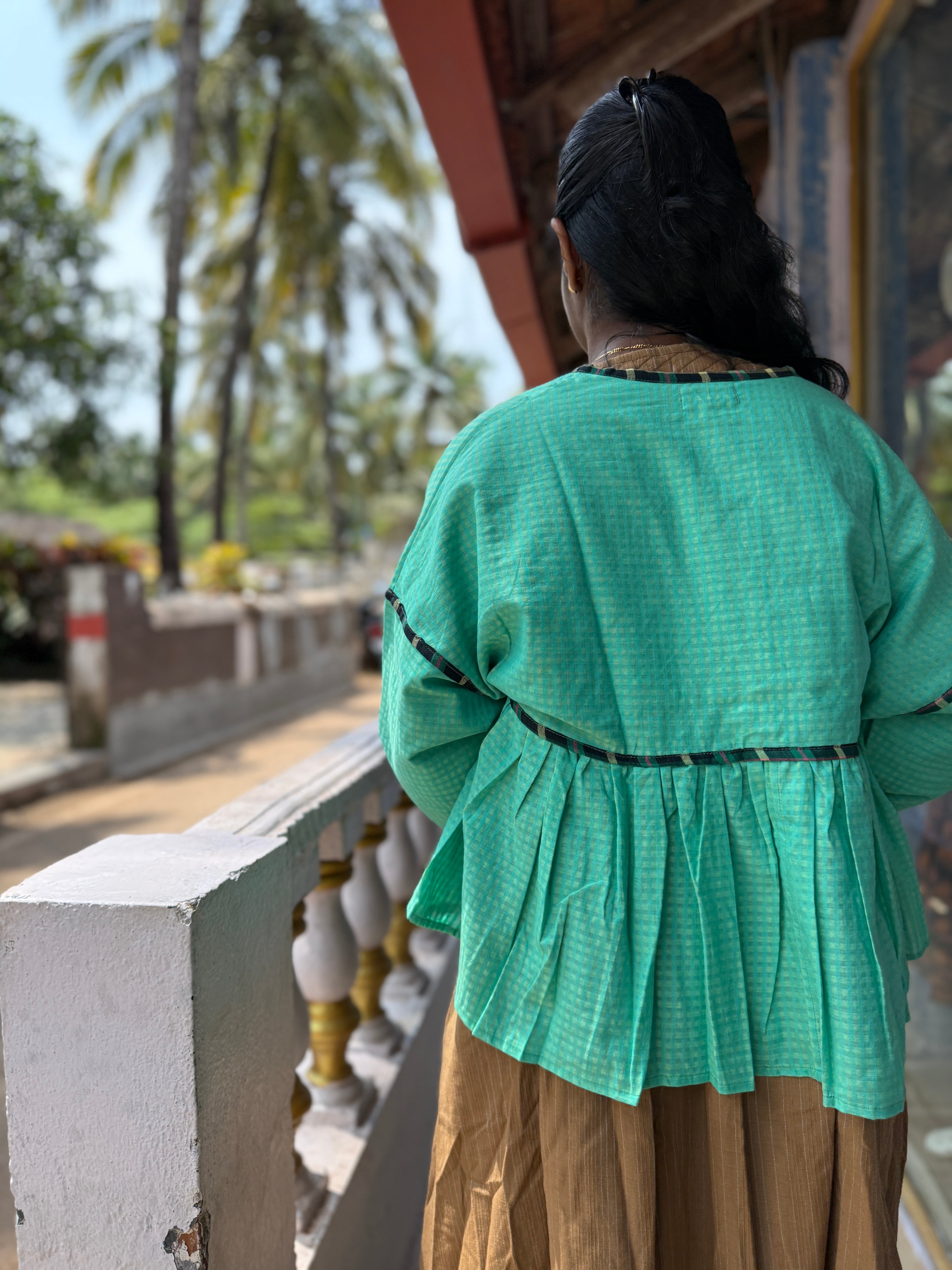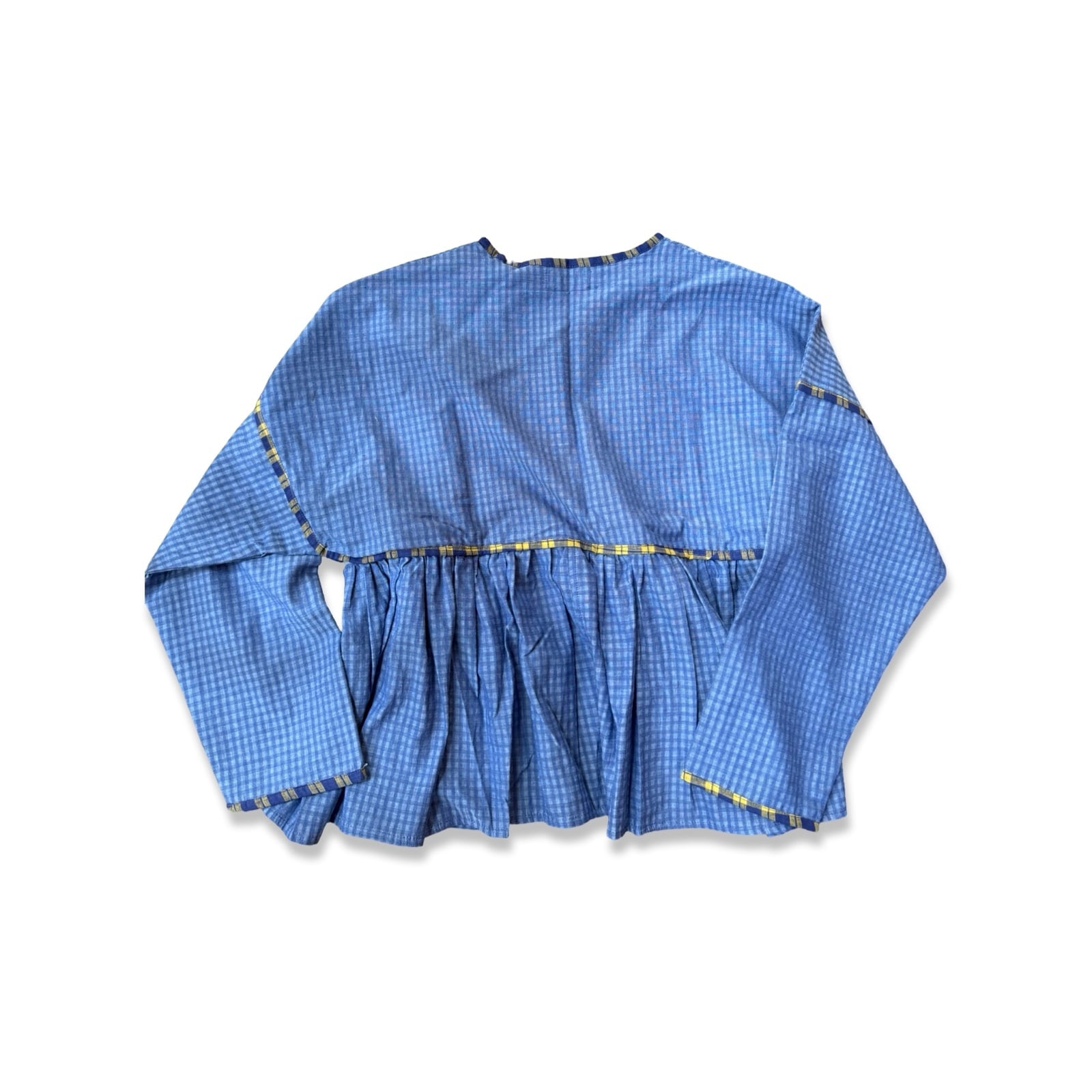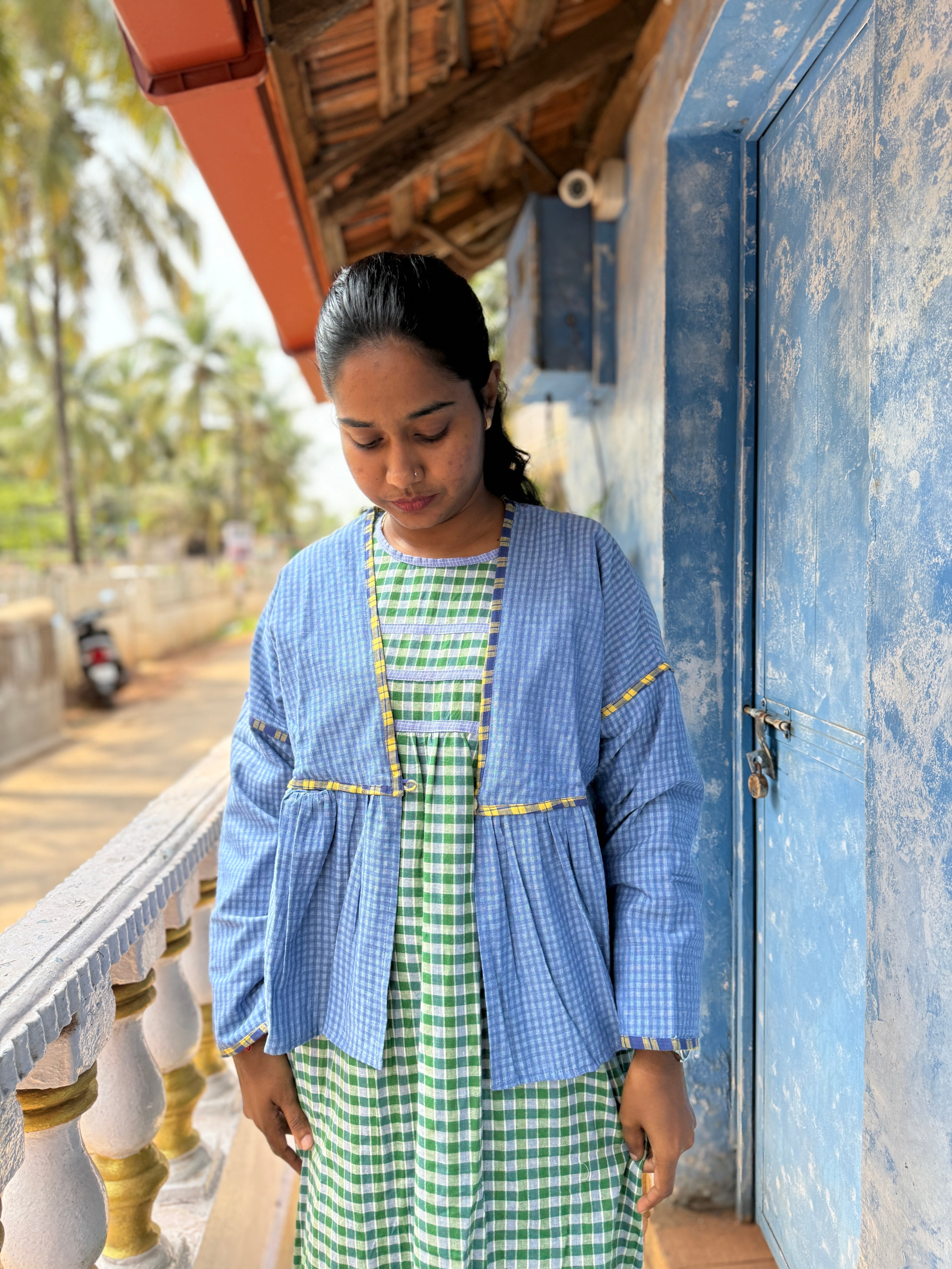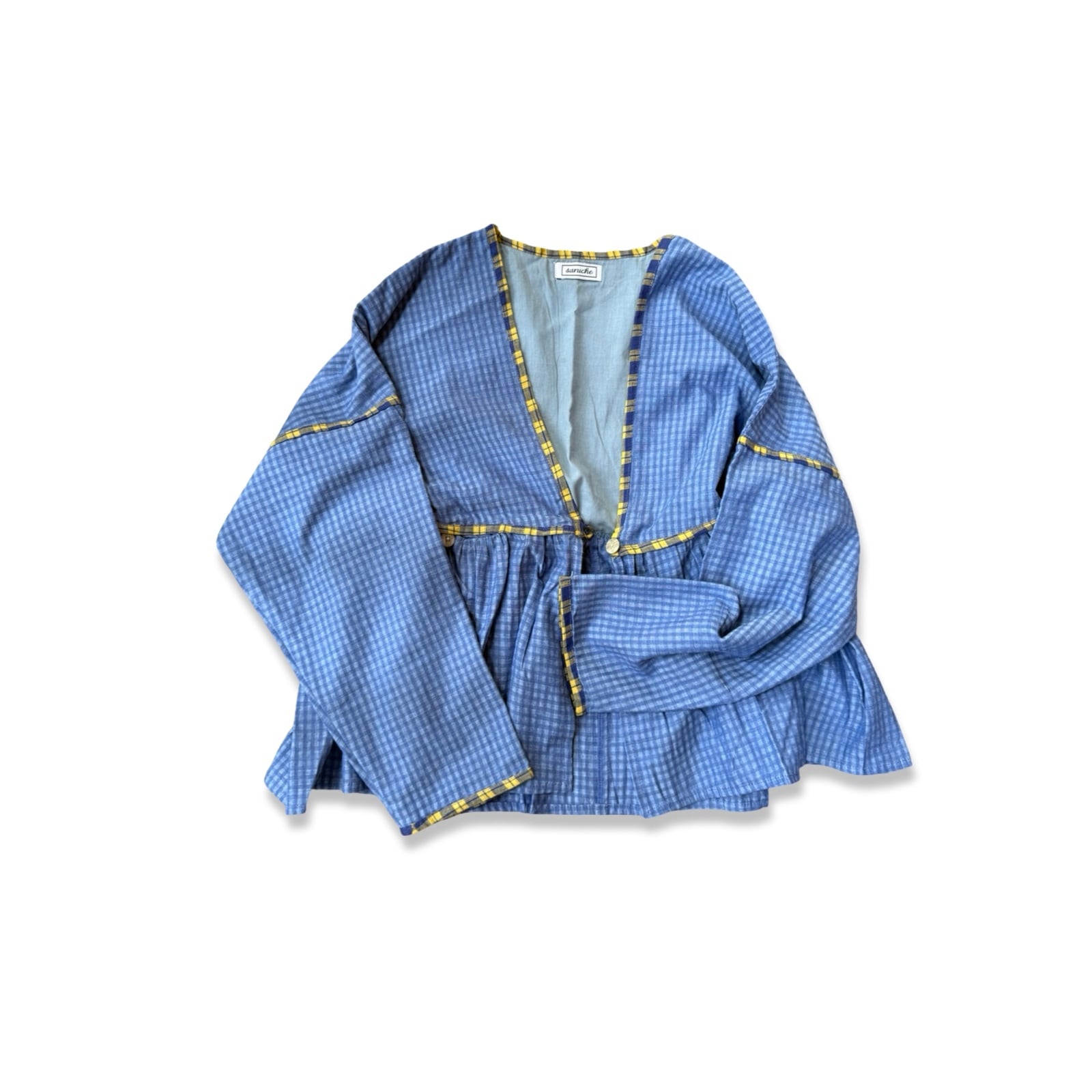 よく見るとギンガムチェックになっていて可愛い色目のサウスコットンにベンガルコットンのパイピングのエッジが効いたジャケット。