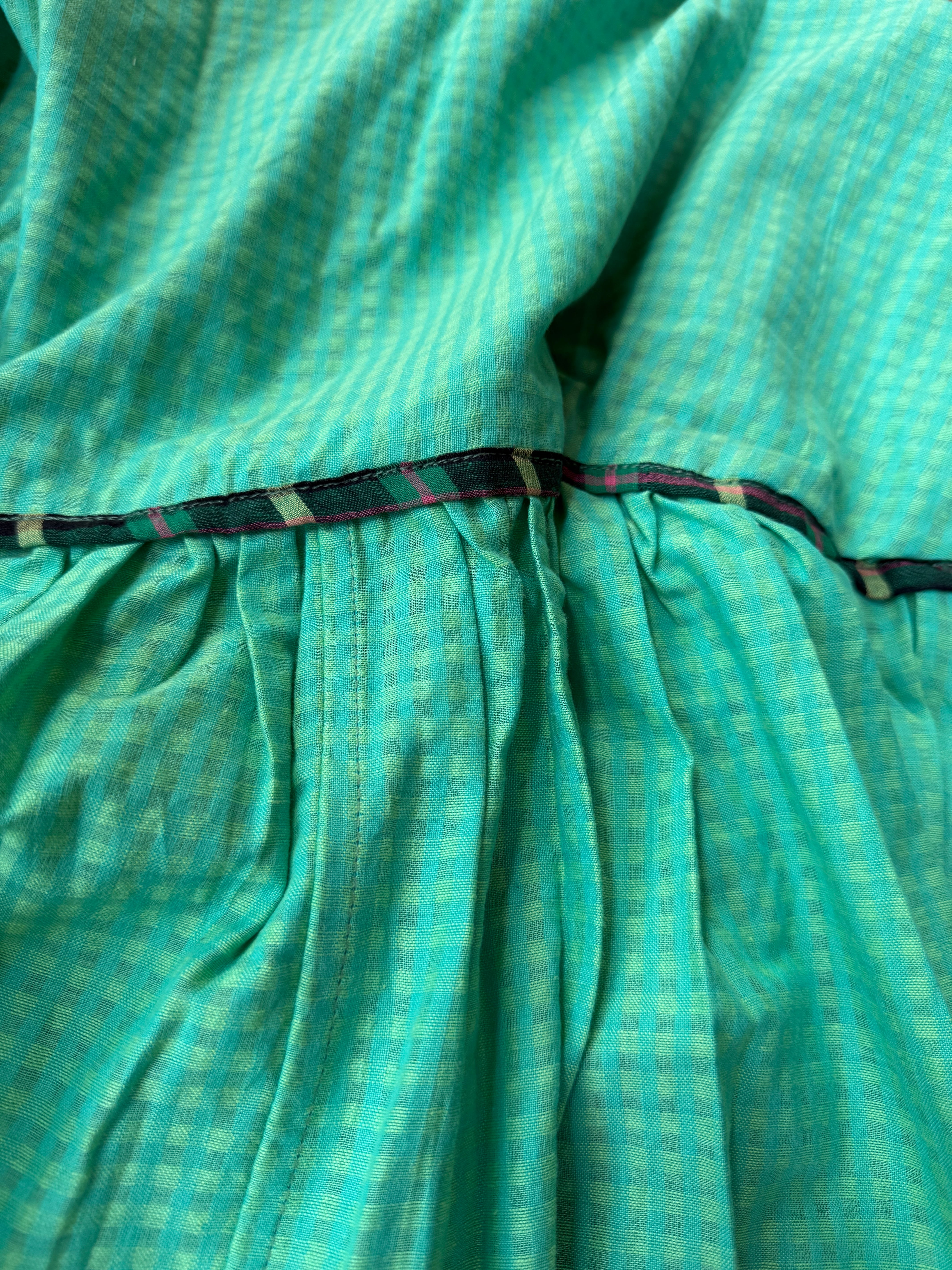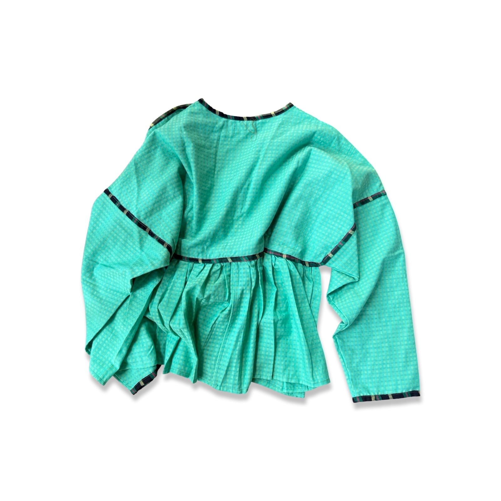 よく見るとギンガムチェックになっていて可愛い色目のサウスコットンにベンガルコットンのパイピングのエッジが効いたジャケット。