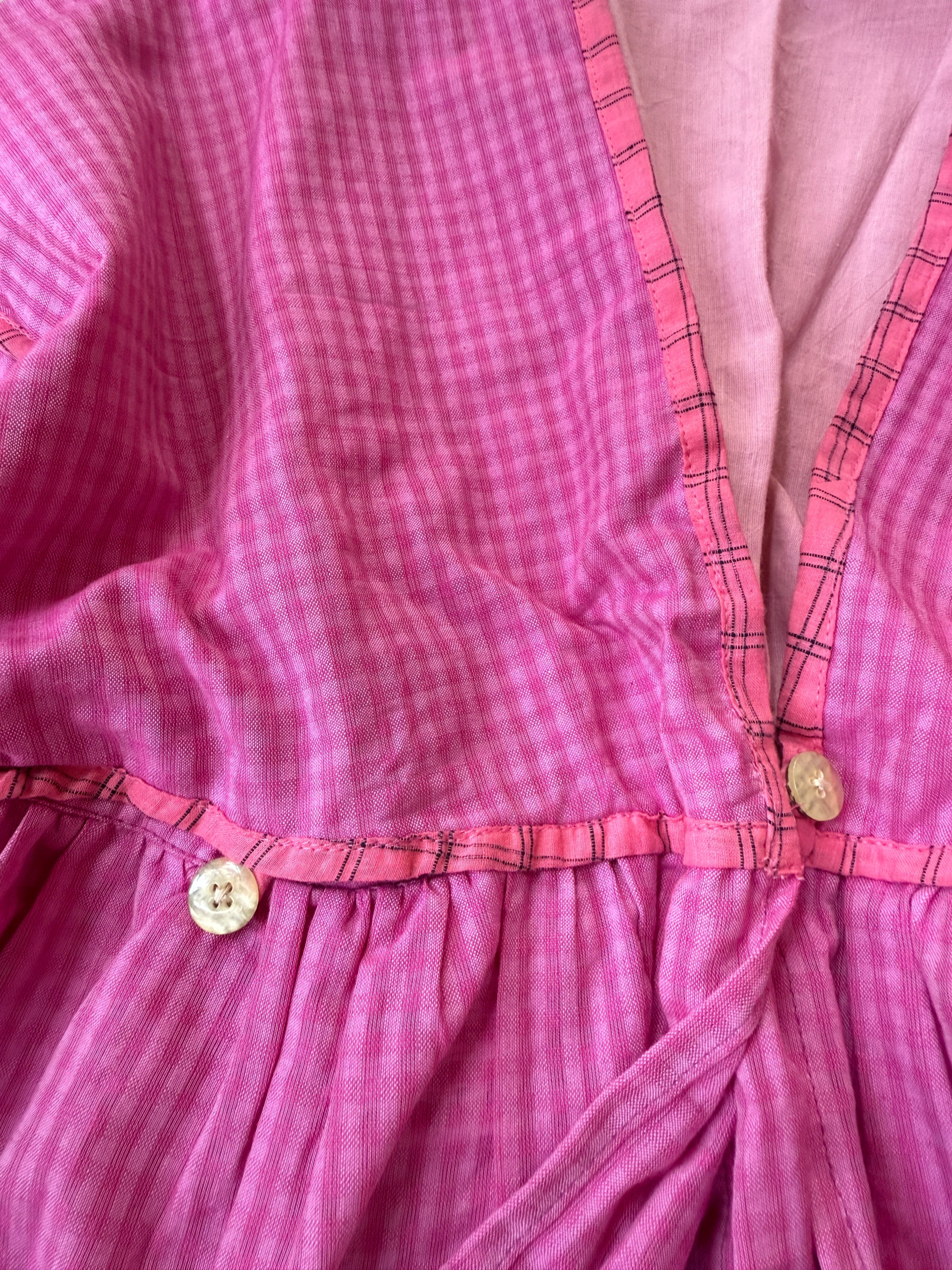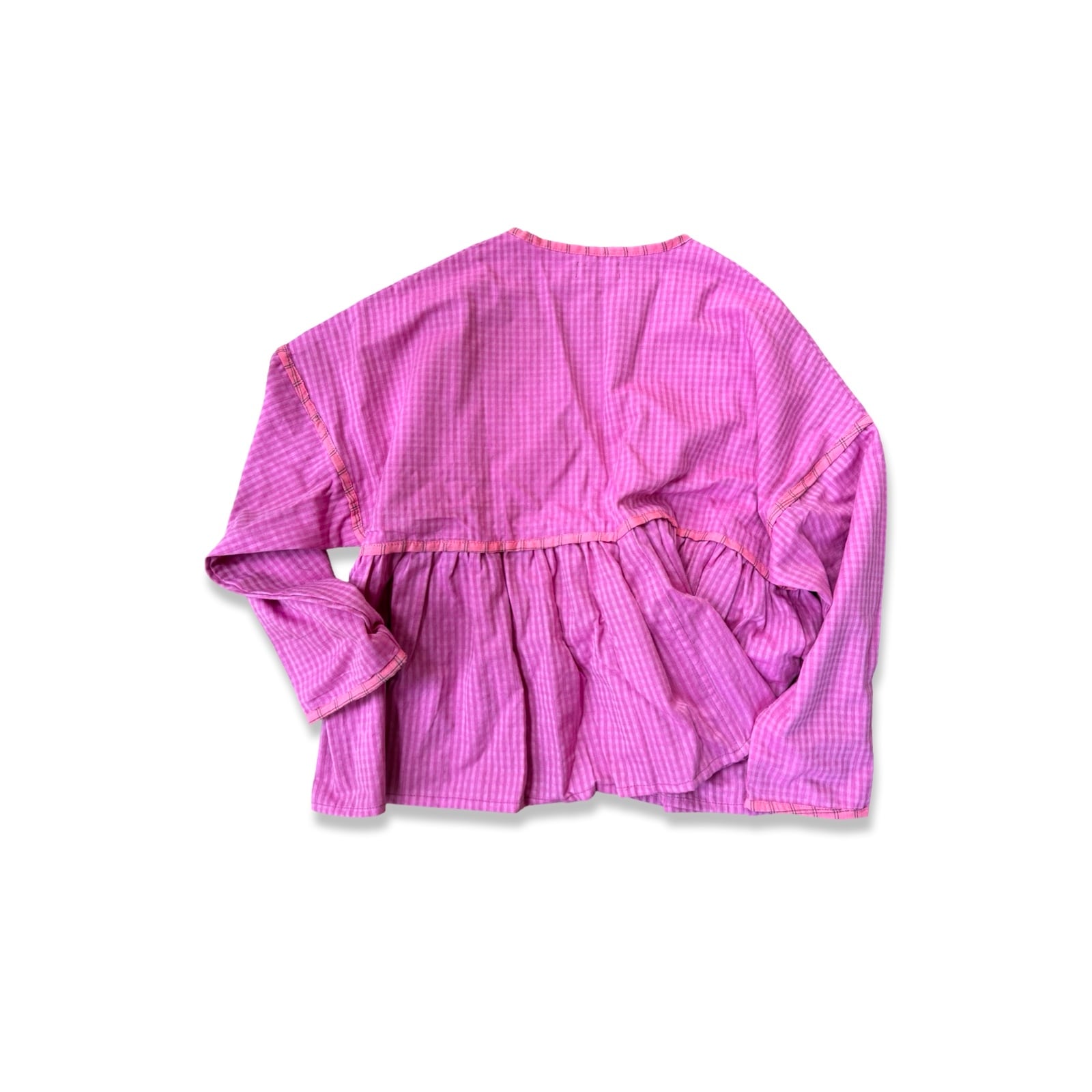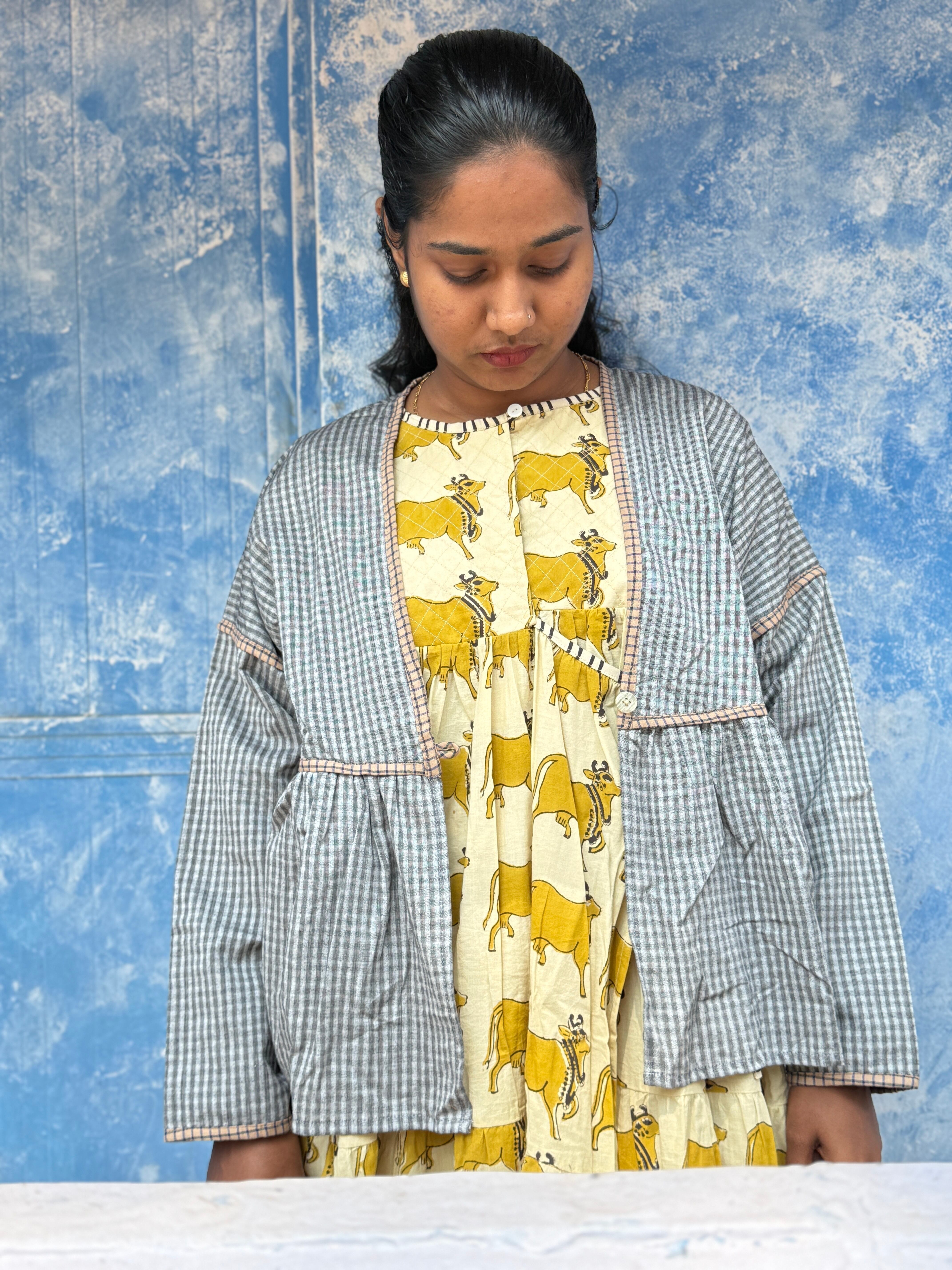 よく見るとギンガムチェックになっていて可愛い色目のサウスコットンにベンガルコットンのパイピングのエッジが効いたジャケット。