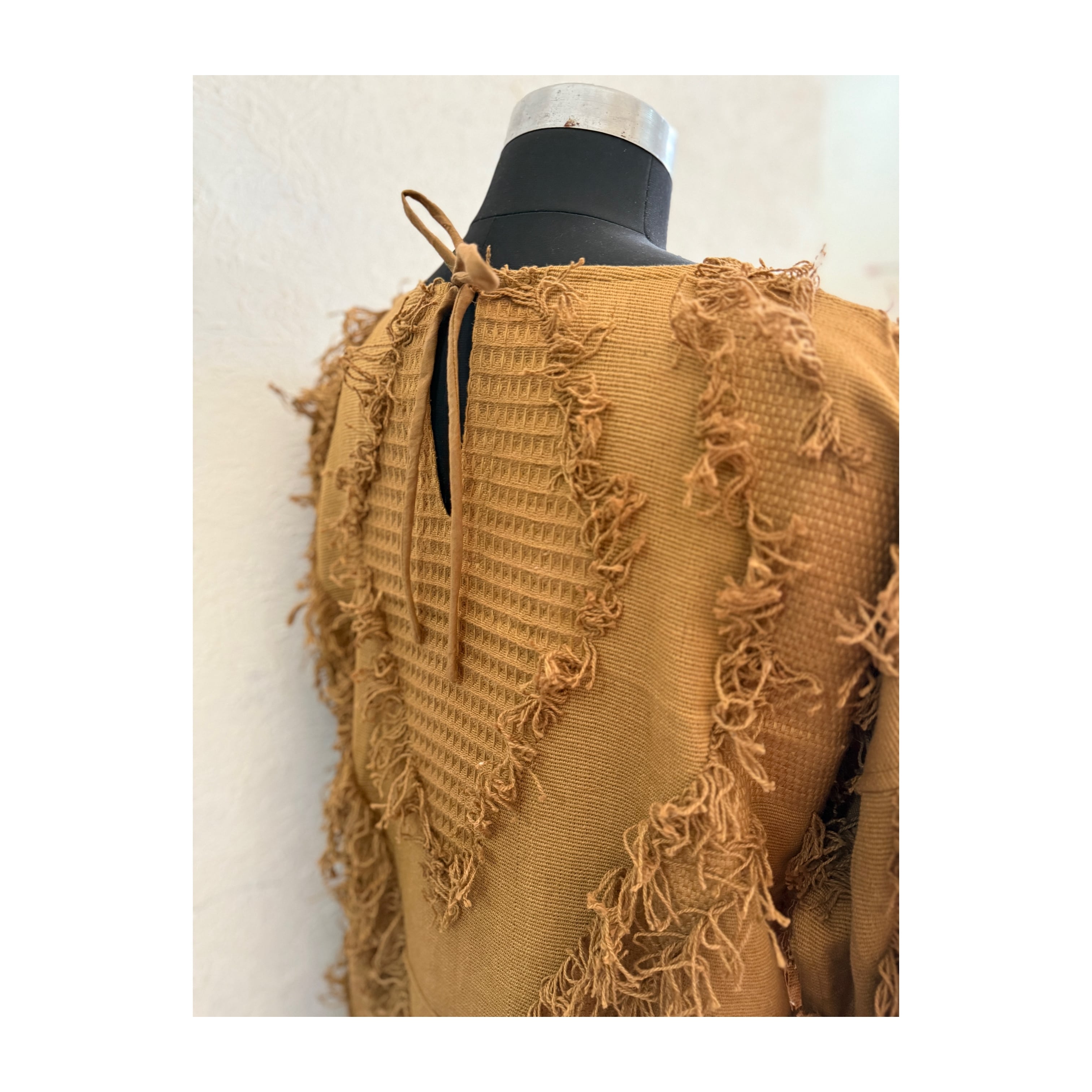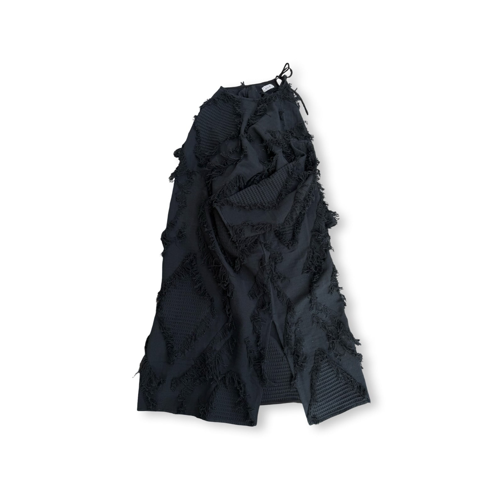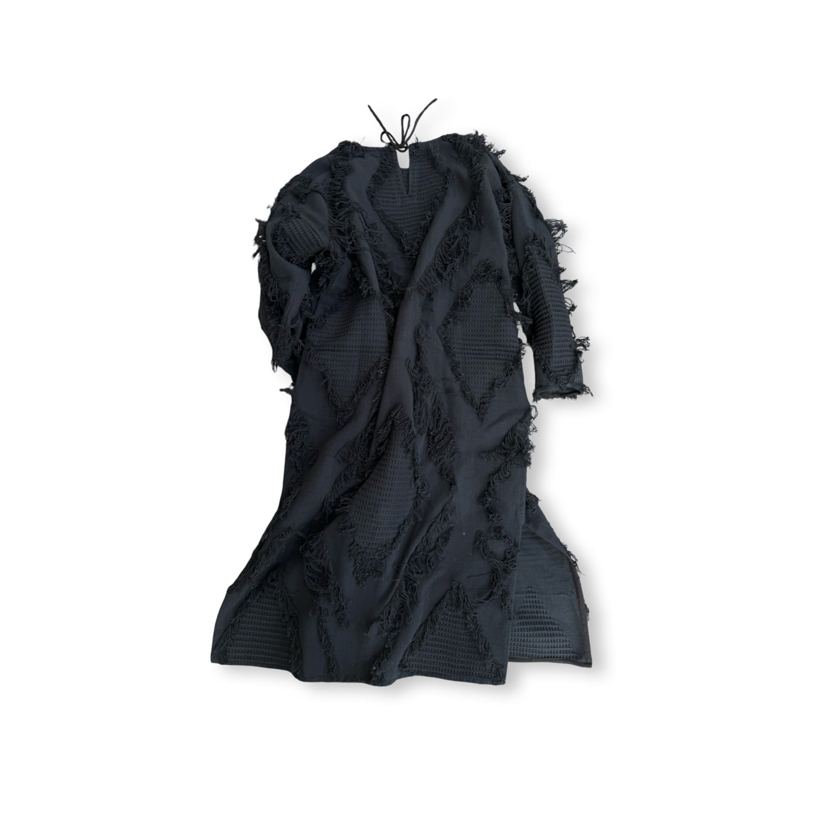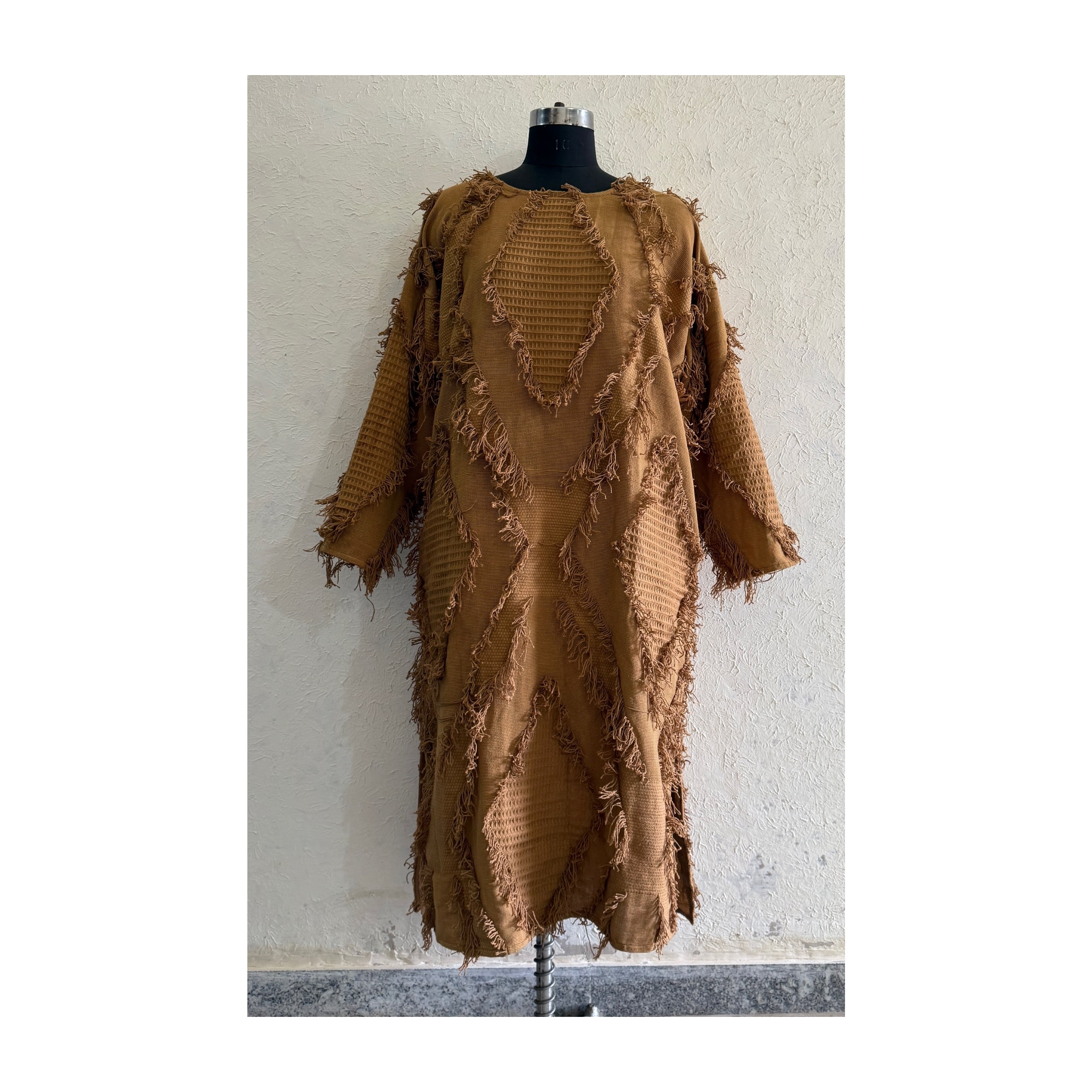 ゆるっとしたサイズ感でこのフリンジ生地によく合うシェイプ。中にたくさん着込めるので冬はアウター感覚で着れるワンピース。