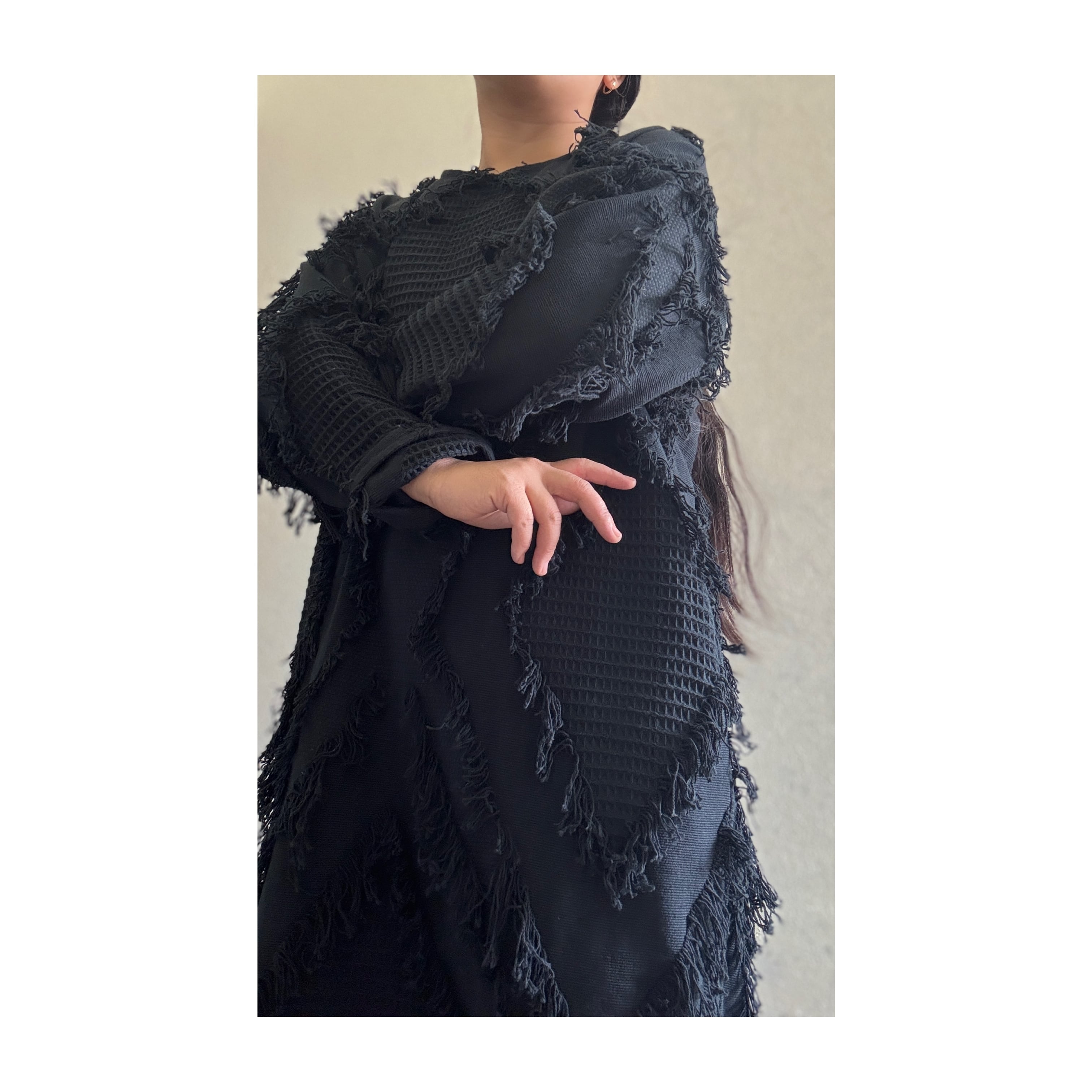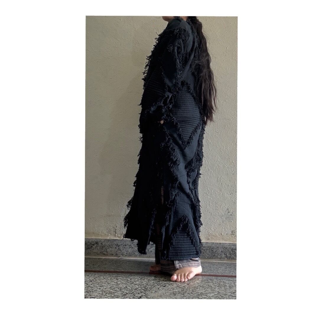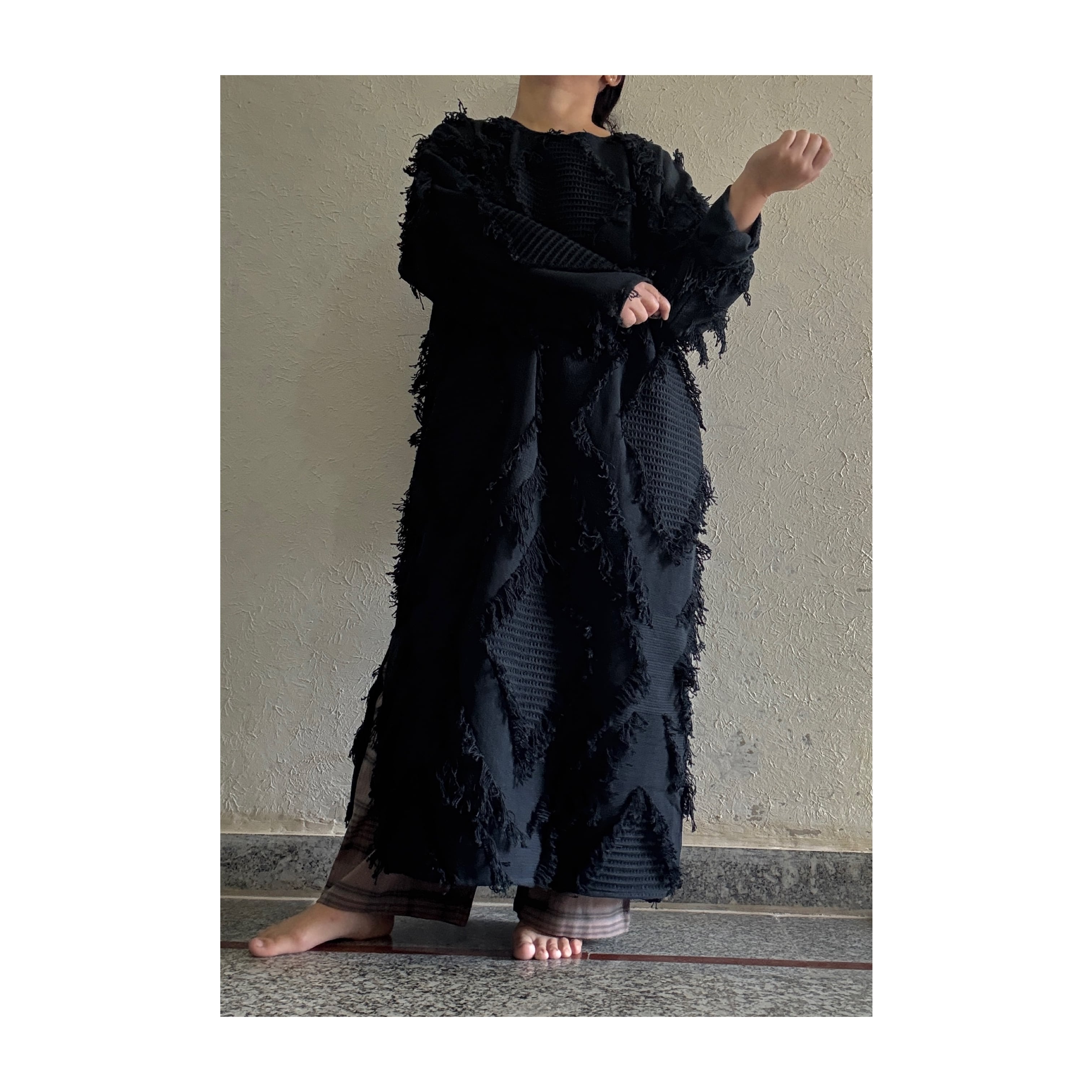 ゆるっとしたサイズ感でこのフリンジ生地によく合うシェイプ。中にたくさん着込めるので冬はアウター感覚で着れるワンピース。