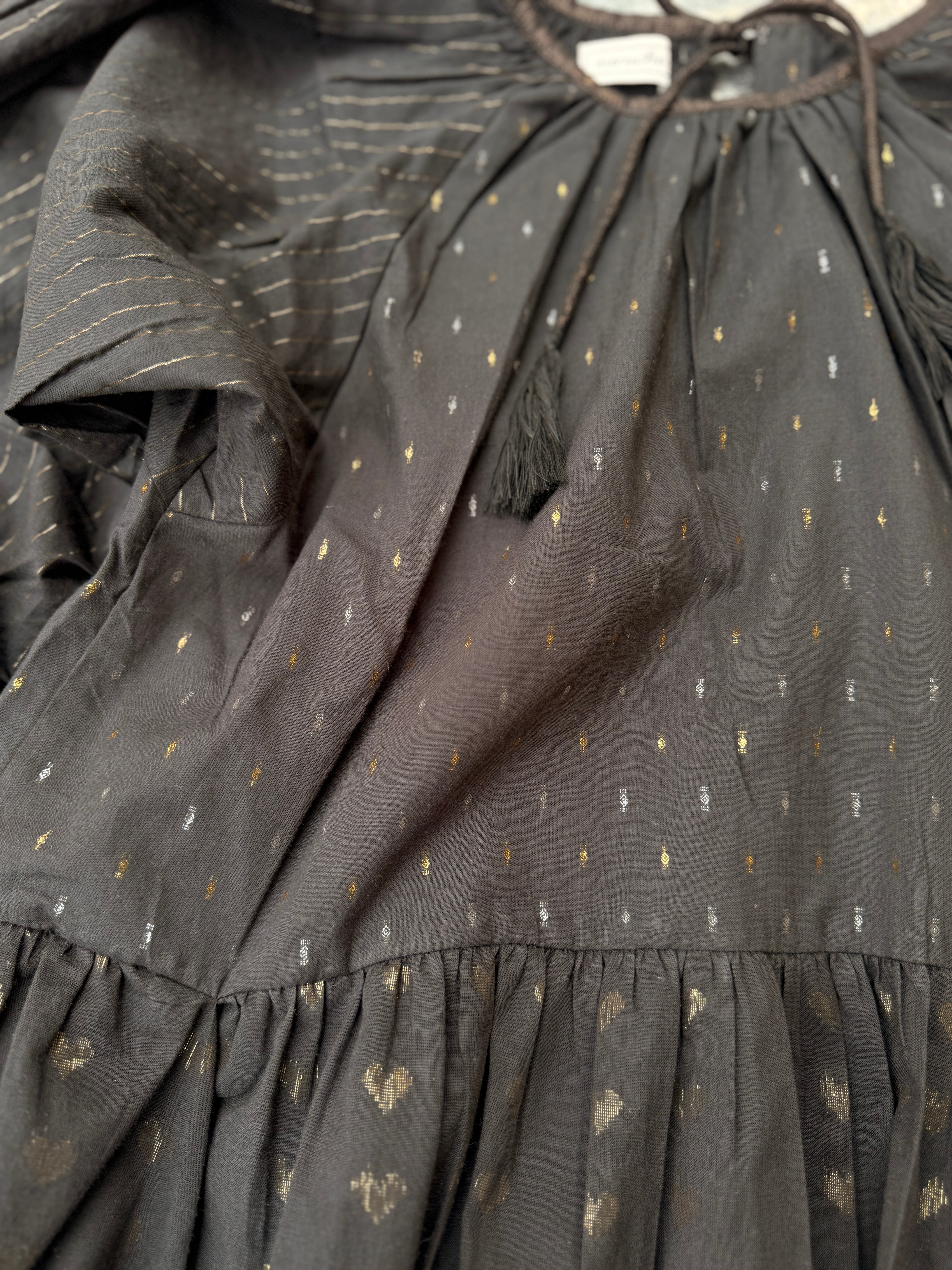 マスリンの柔らかいコットンやゴールドがキラキラと控えめに輝くテキスタイルをドッキングした一着。
