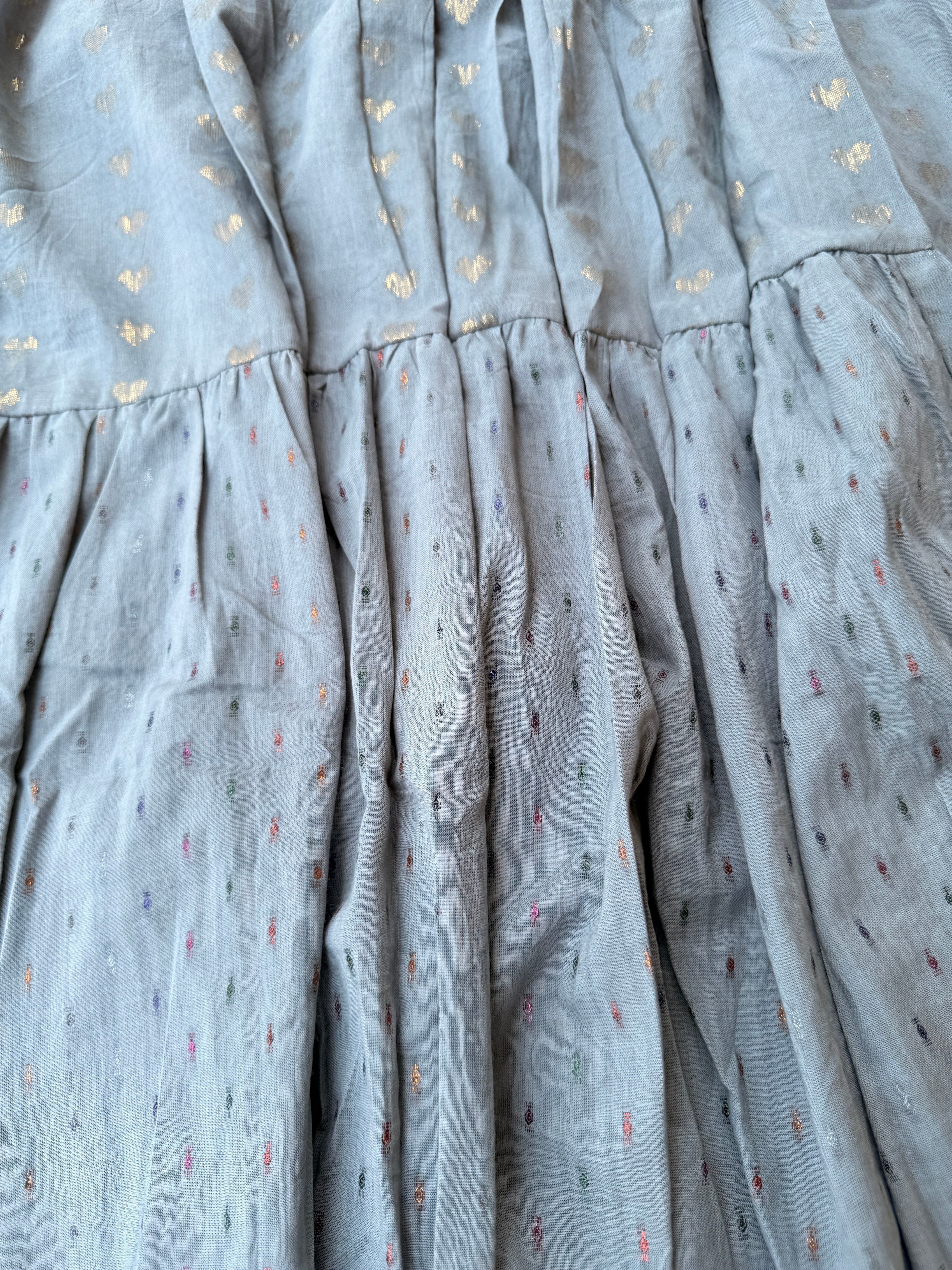 マスリンの柔らかいコットンやゴールドがキラキラと控えめに輝くテキスタイルをドッキングした一着。