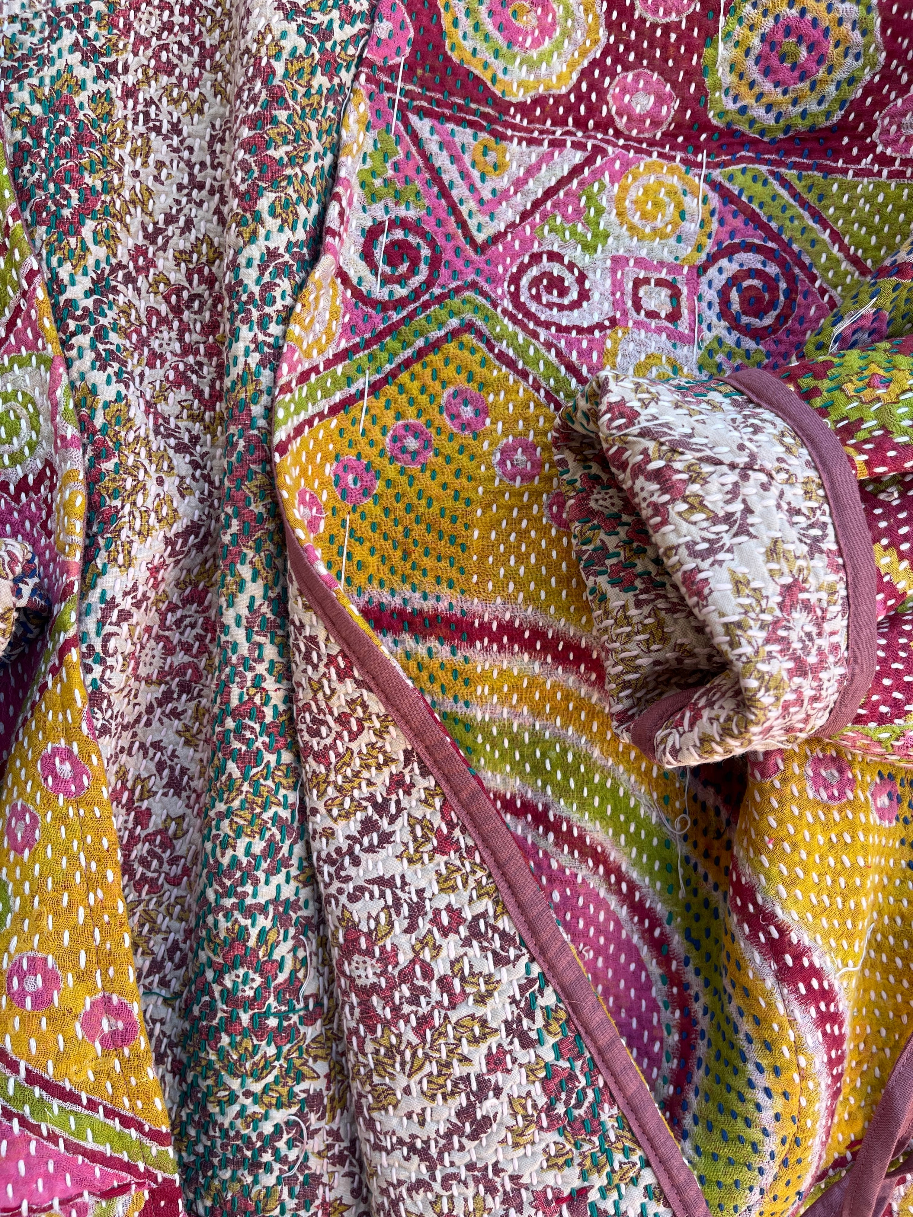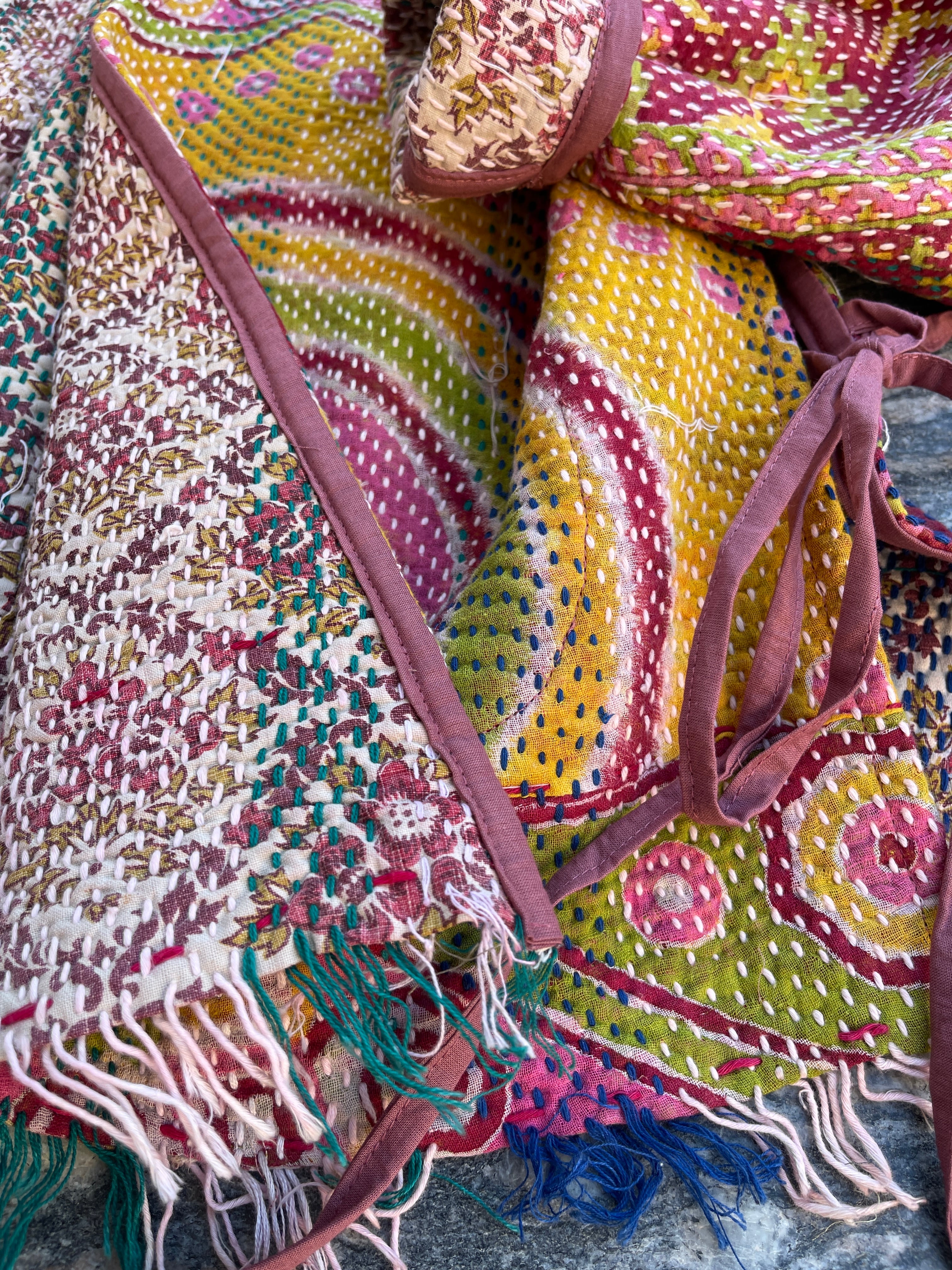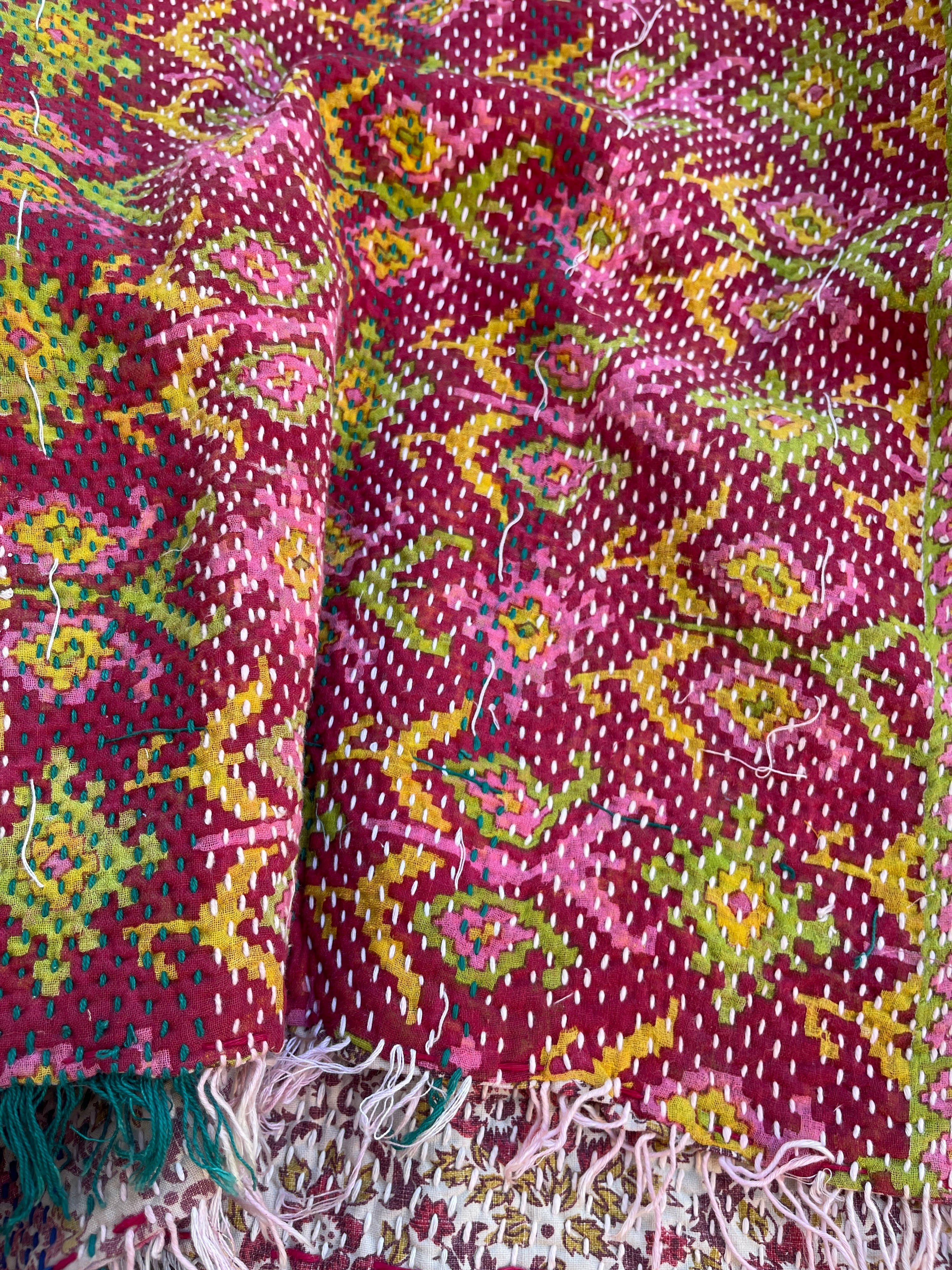 こちらは重みある手刺繍はアートのような美しさが魅力のパキスタンカンタ。